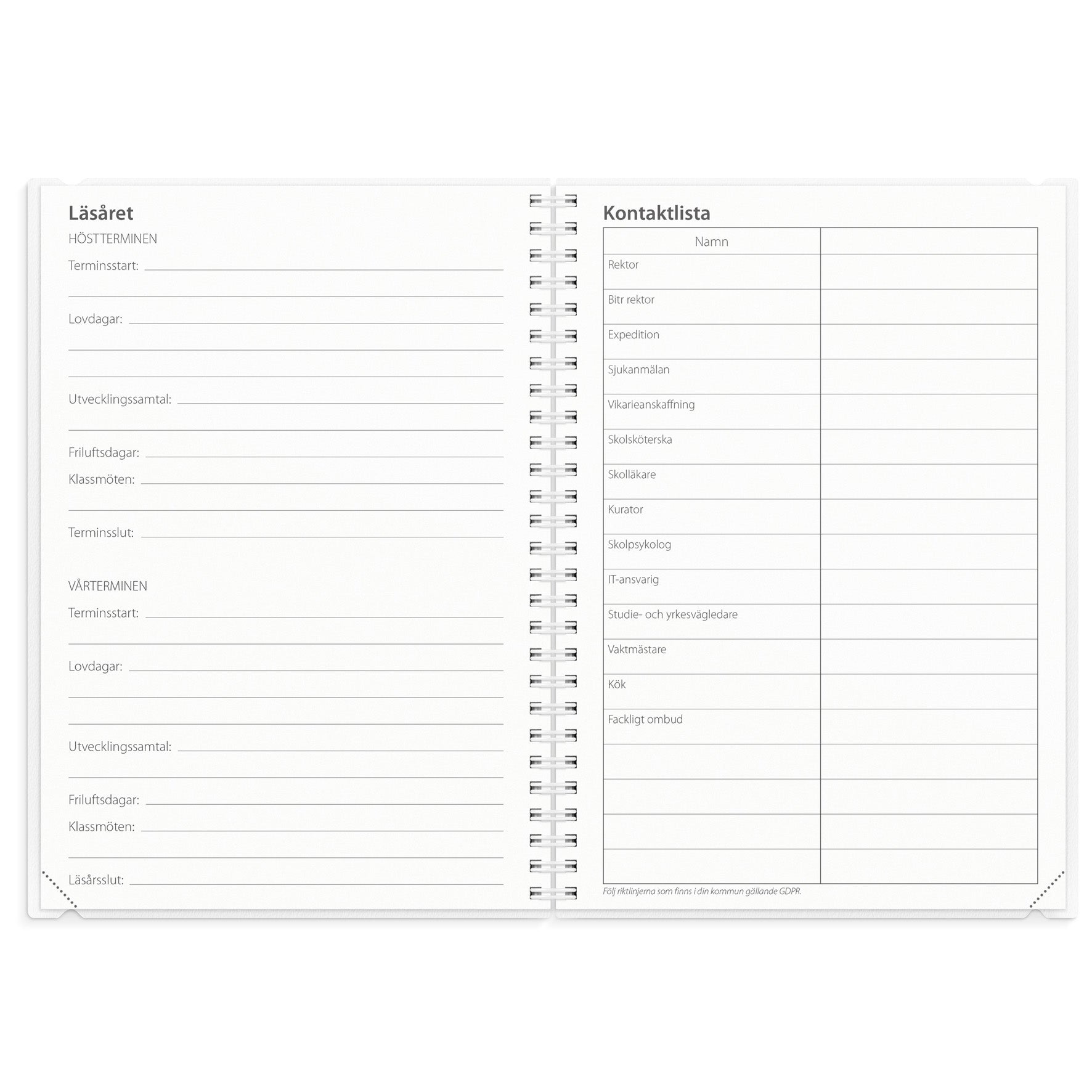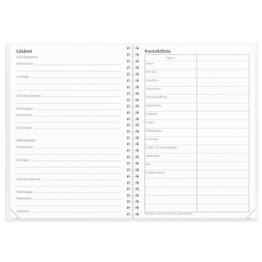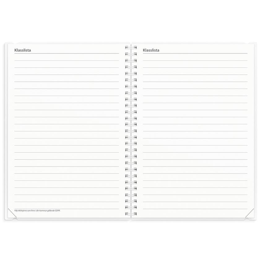 Det perfekta komplementet till undervisningen. Där du kan kartlägga framsteg, har översikt över schema och provresultat samt föra andra anteckningar. Fungerar även utmärkt som en kontaktbok mot elevens målsman och underlag för samarbete med elever. Ett omslag i praktisk plastficka med två alternativ till framsida i olika kulörer och med alternativ att göra kalendern mer personlig.
