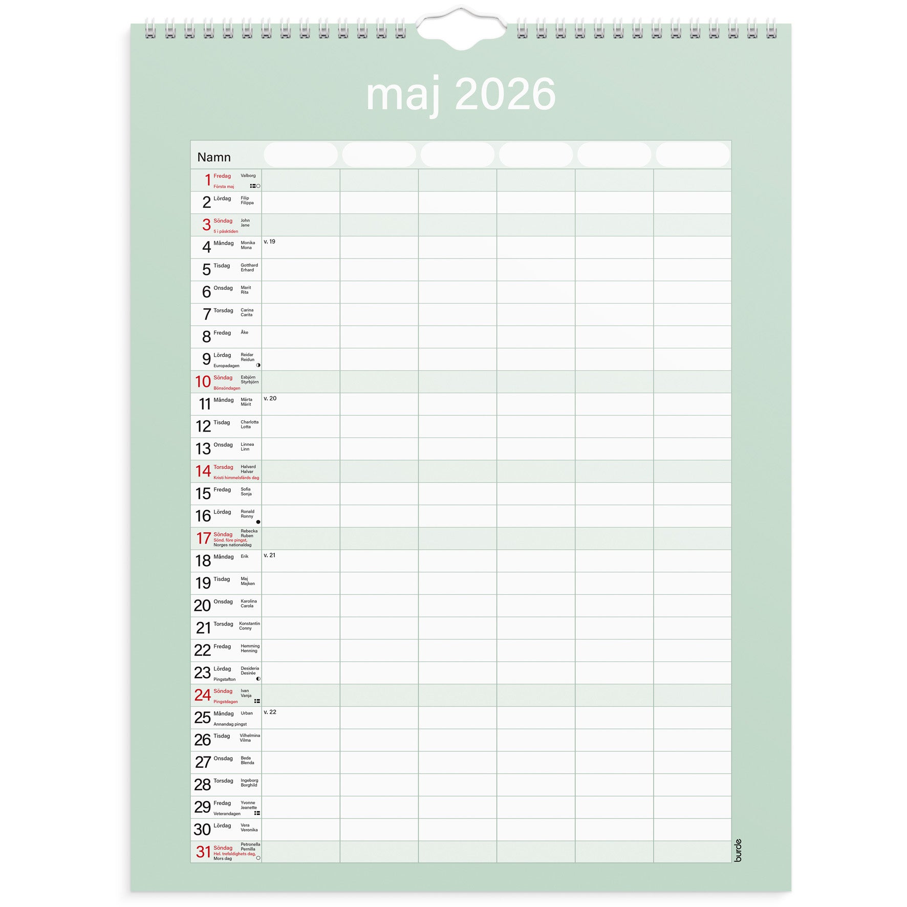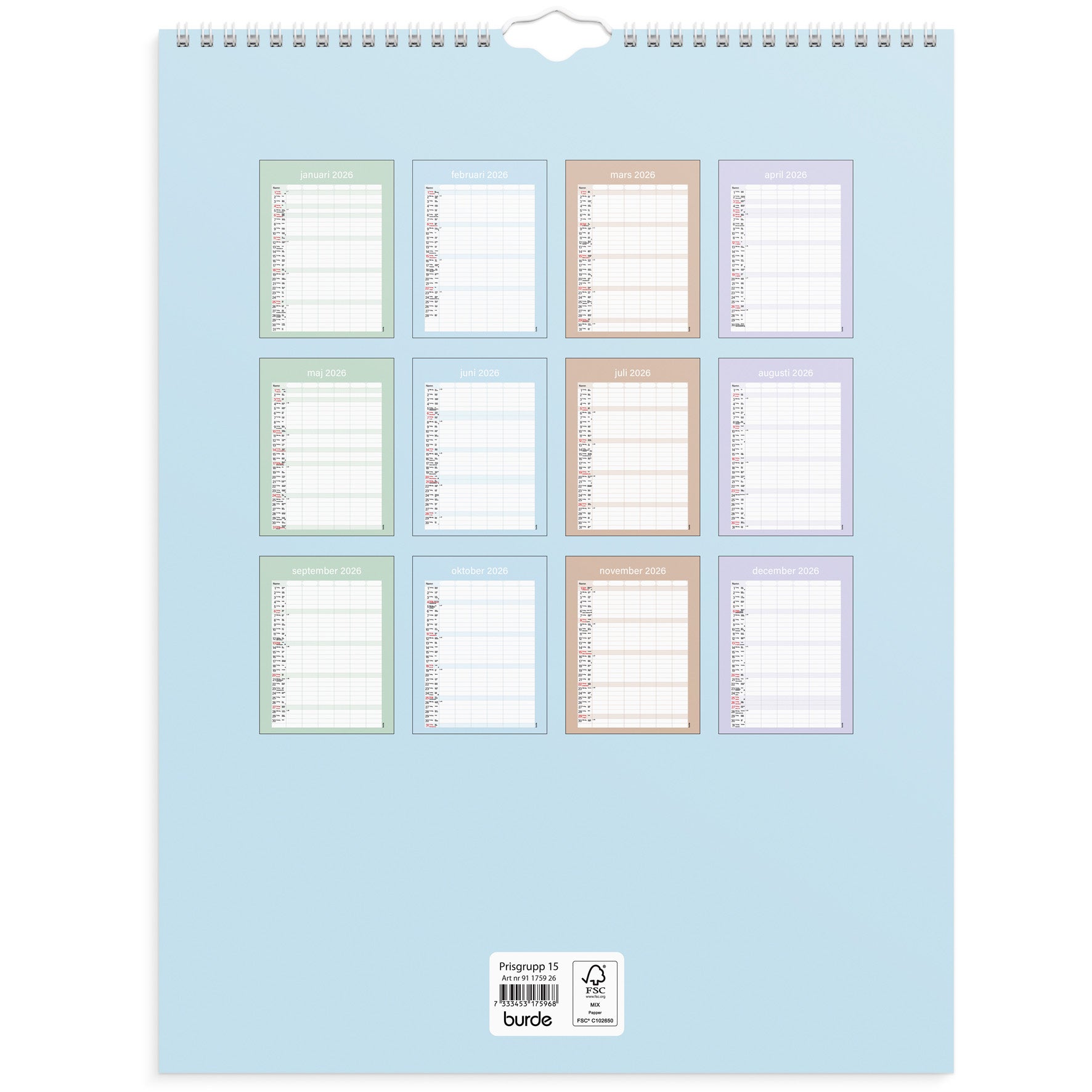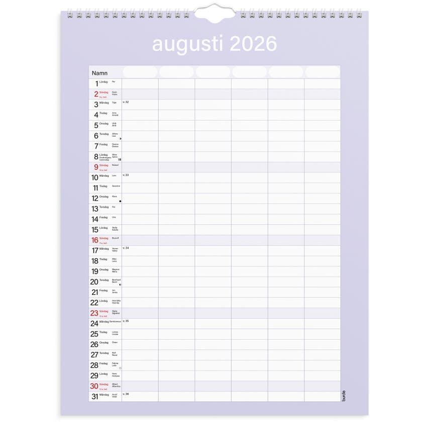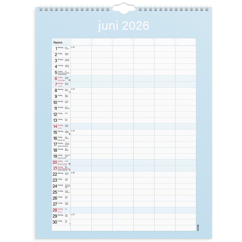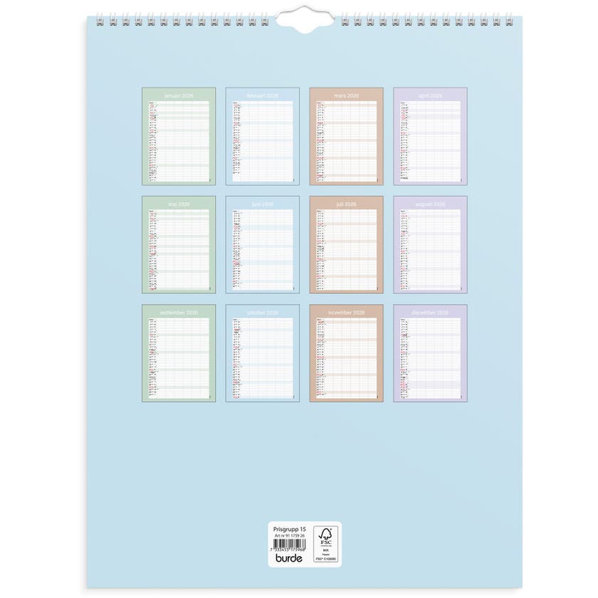 Familjekalender Praktisk från Burde, spiralbunden och med en månad per blad.