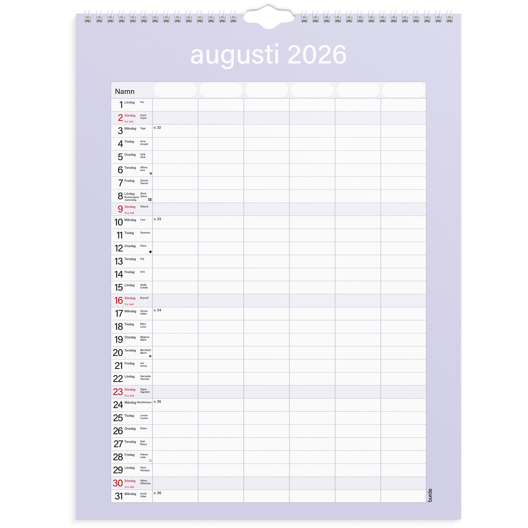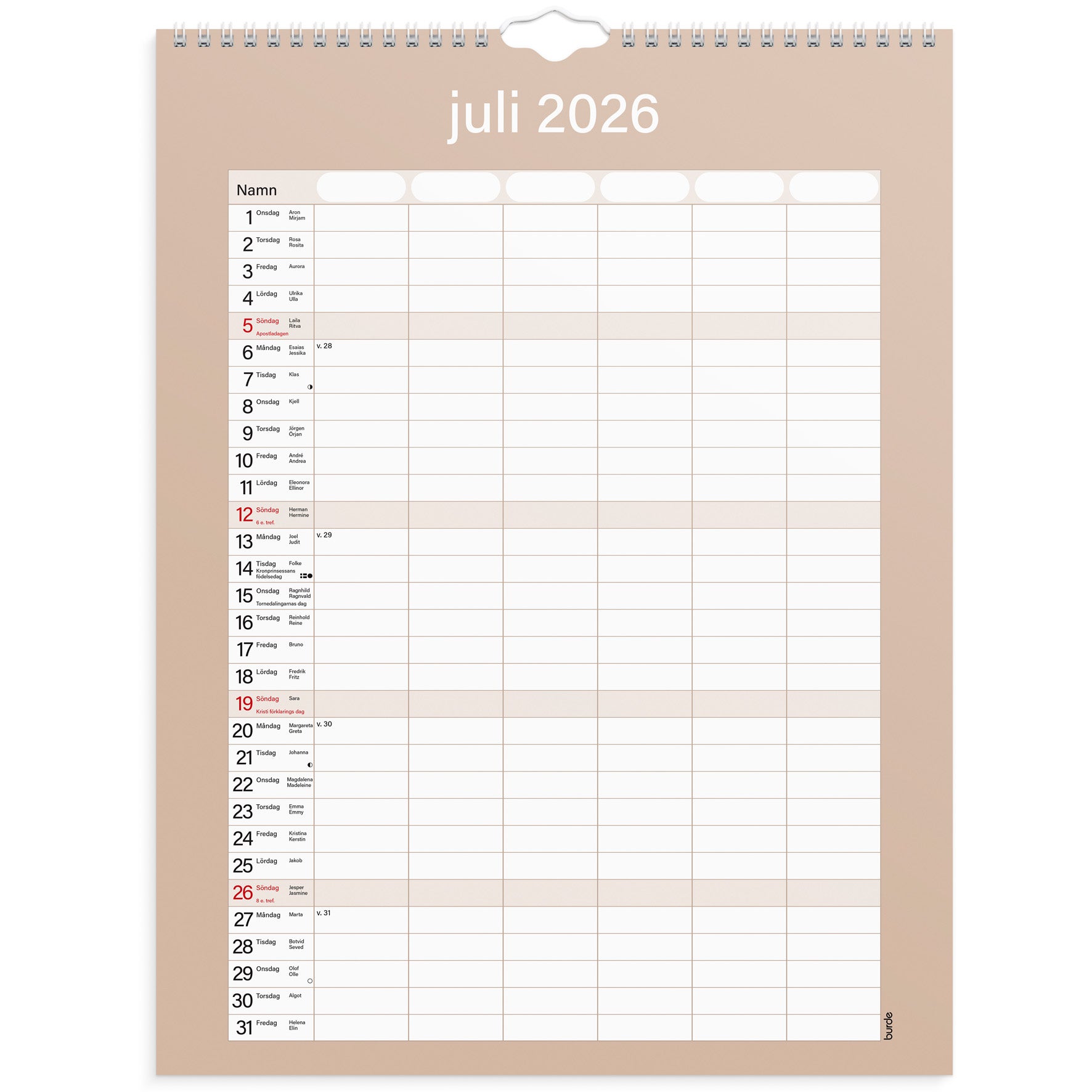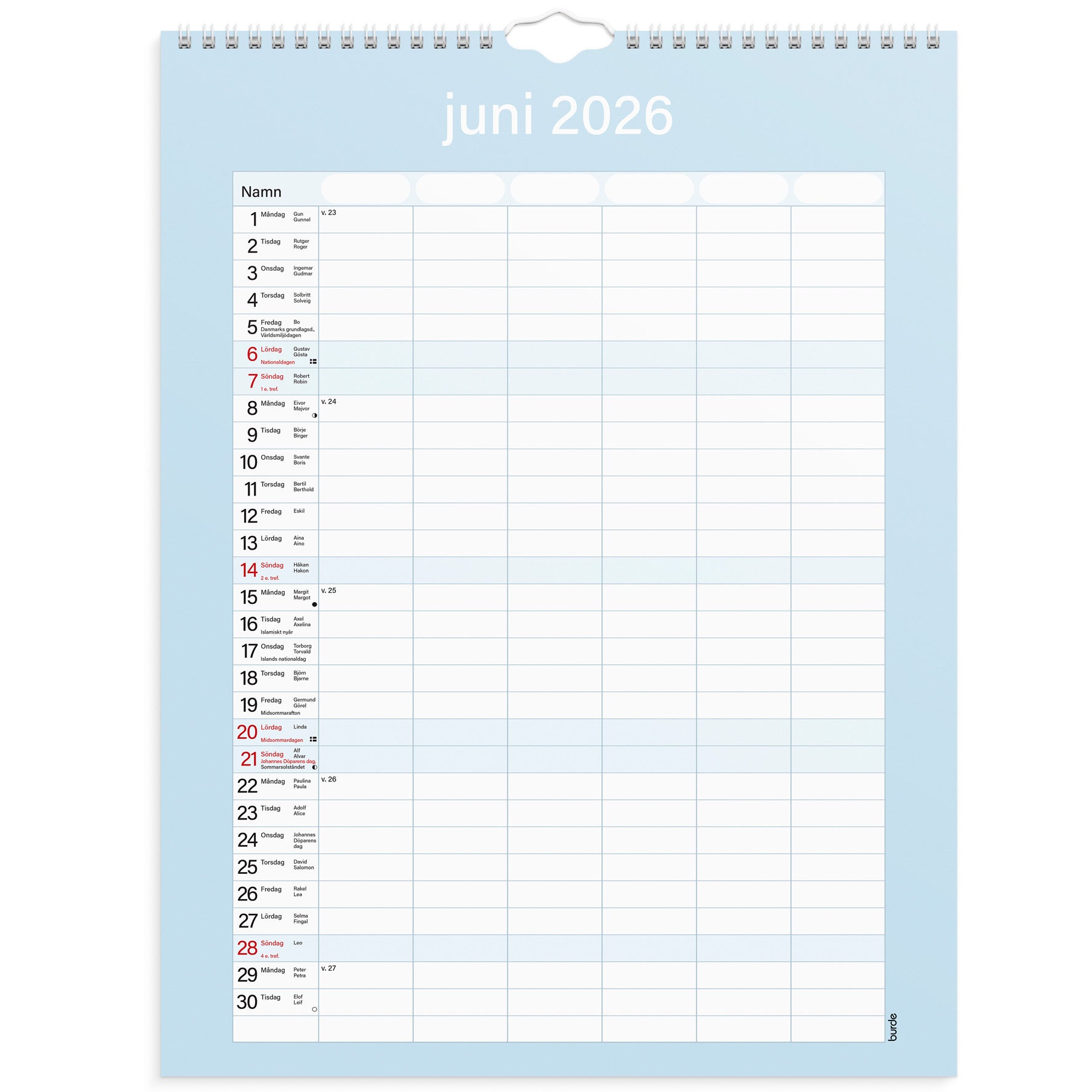 Familjekalender Praktisk från Burde, spiralbunden och med en månad per blad.