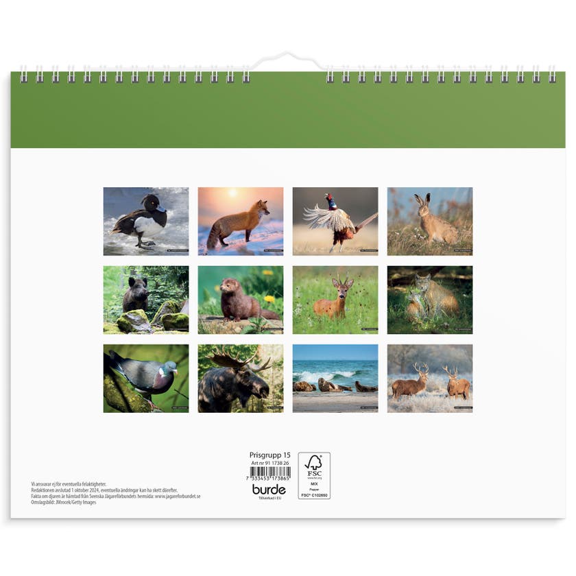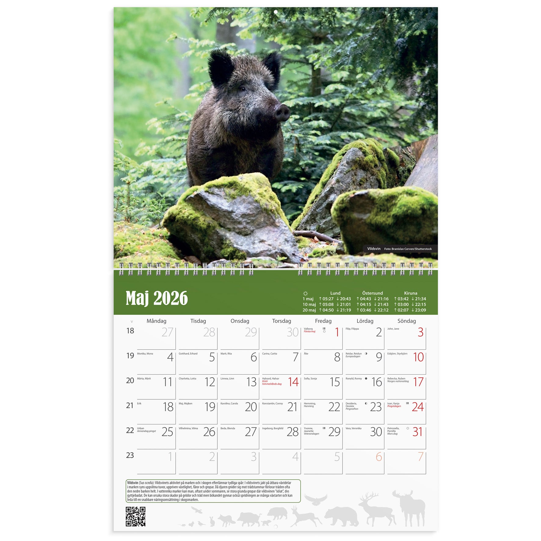 Väggkalender för den jaktintresserade! Via QR-kod får du information om när jaktperioder inträffar för olika djur i Sverige. Soltider för tre horisonter. Vackra bilder på svenska vilda djur.