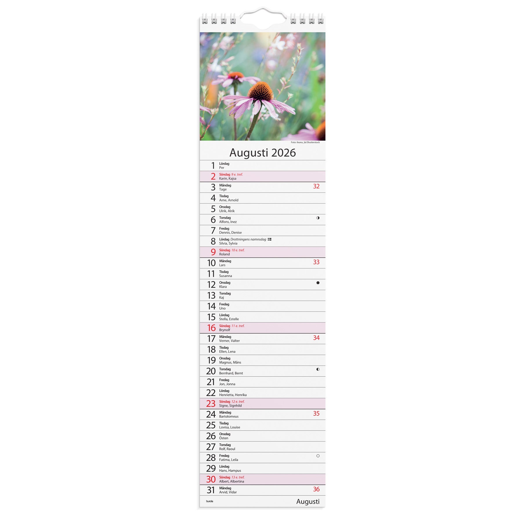 Lilla Hemkalendern i väggformat från Burde. En månad per dag, spiralbunden.