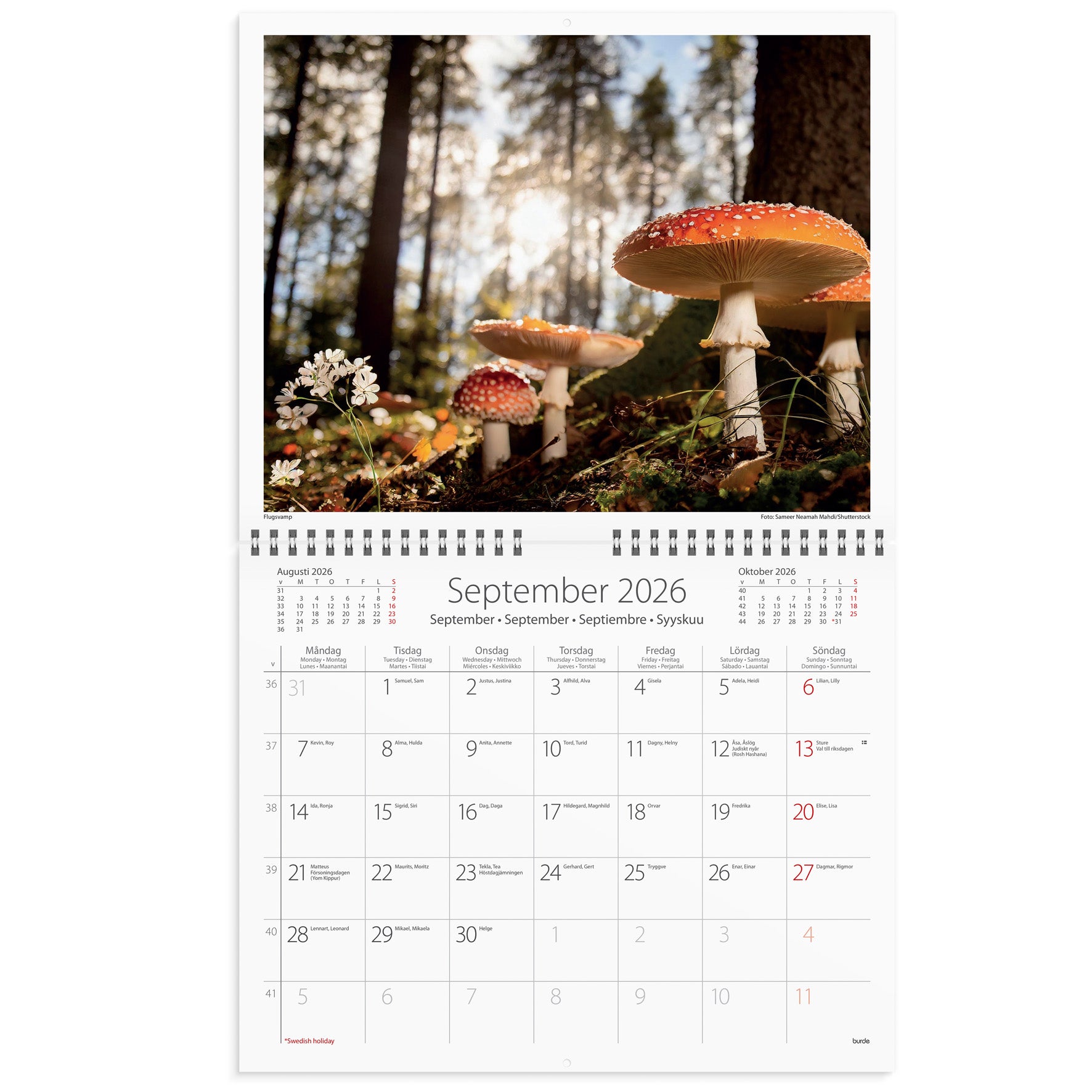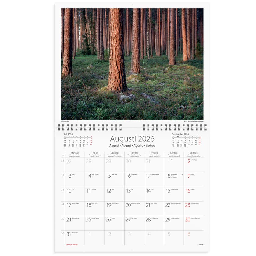 Kalender Vår vackra skog i väggformat från Burde. Tolv bilder från svenska skogar och dess djurliv. Femspråkig (svenska, engelska, tyska, spanska och finska) och med svenska namnsdagar.