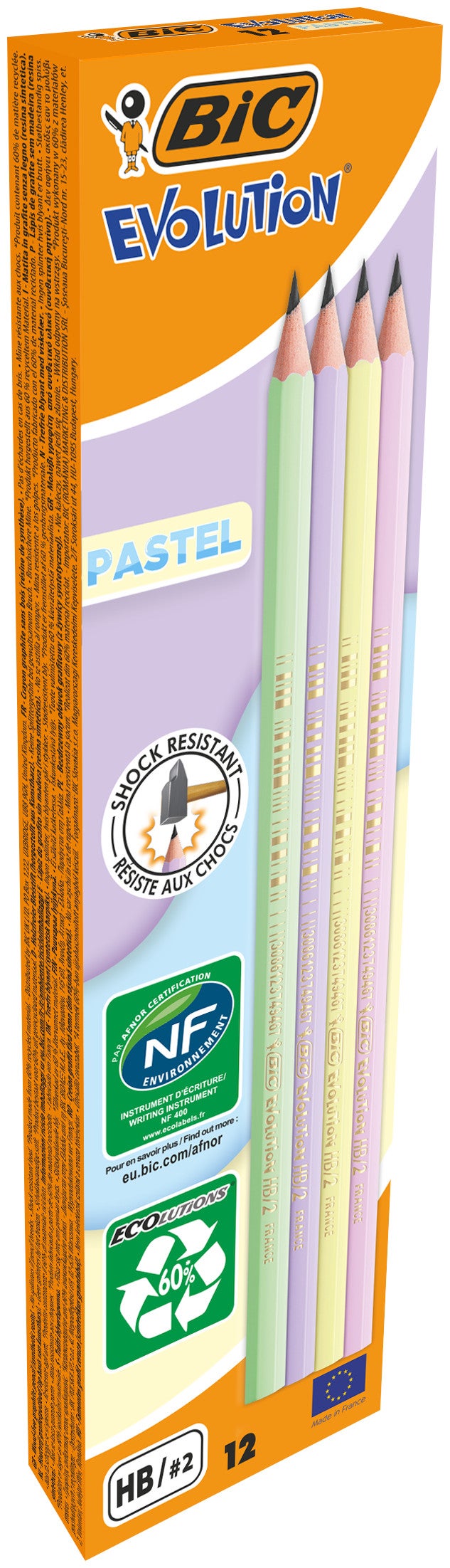 Evolution Pastell från Bic är en sexkantig blyertspenna med extra starka HB-stift. Pennkropp i härliga pastellfärger: grön, gul, rosa och lila. Förpackningen innehåller tre pennor i vardera färg. Miljömärkt med NF Environment Ecolabel. Tillverkade i Europa av 60% återvunnet material. Träfri blyertspenna som inte flisar sig.