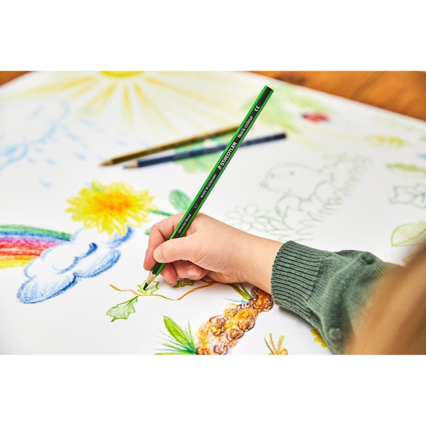 Klassiska Noris färgblyertspennor från Staedtler, av hög kvalitet med högt pigmentinnehåll.. Unik ritupplevelse tack vare den gummerade ytan..