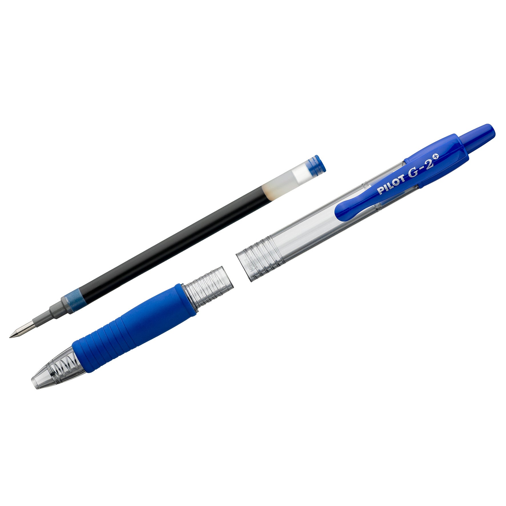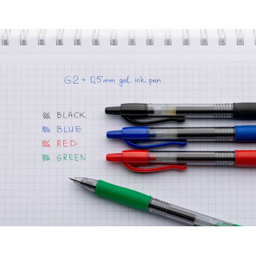 Gelpenna Pilot G-2+ med gummigrepp och klickmekanism med klips. Är en snygg påfyllningsbar penna som har en mjuk skrift som glider lätt över pappret med det mjuka gelbläcket, och är extra smidig att skriva med. Transparent pennkropp med färgat gummigrepp och klips, samtidigt ser du hur mycket som finns kvar i pennan. Dokumentäkta bläck enligt ISO 27668-2. Passar utmärkt om du är på jakt efter arkivbeständiga pennor.