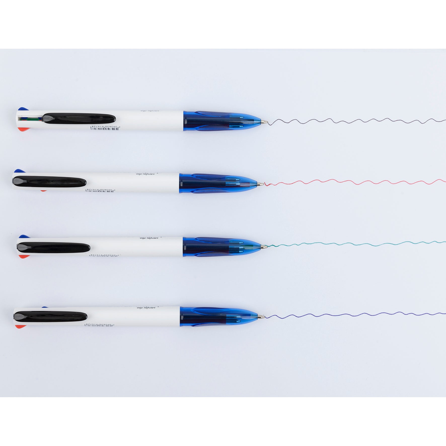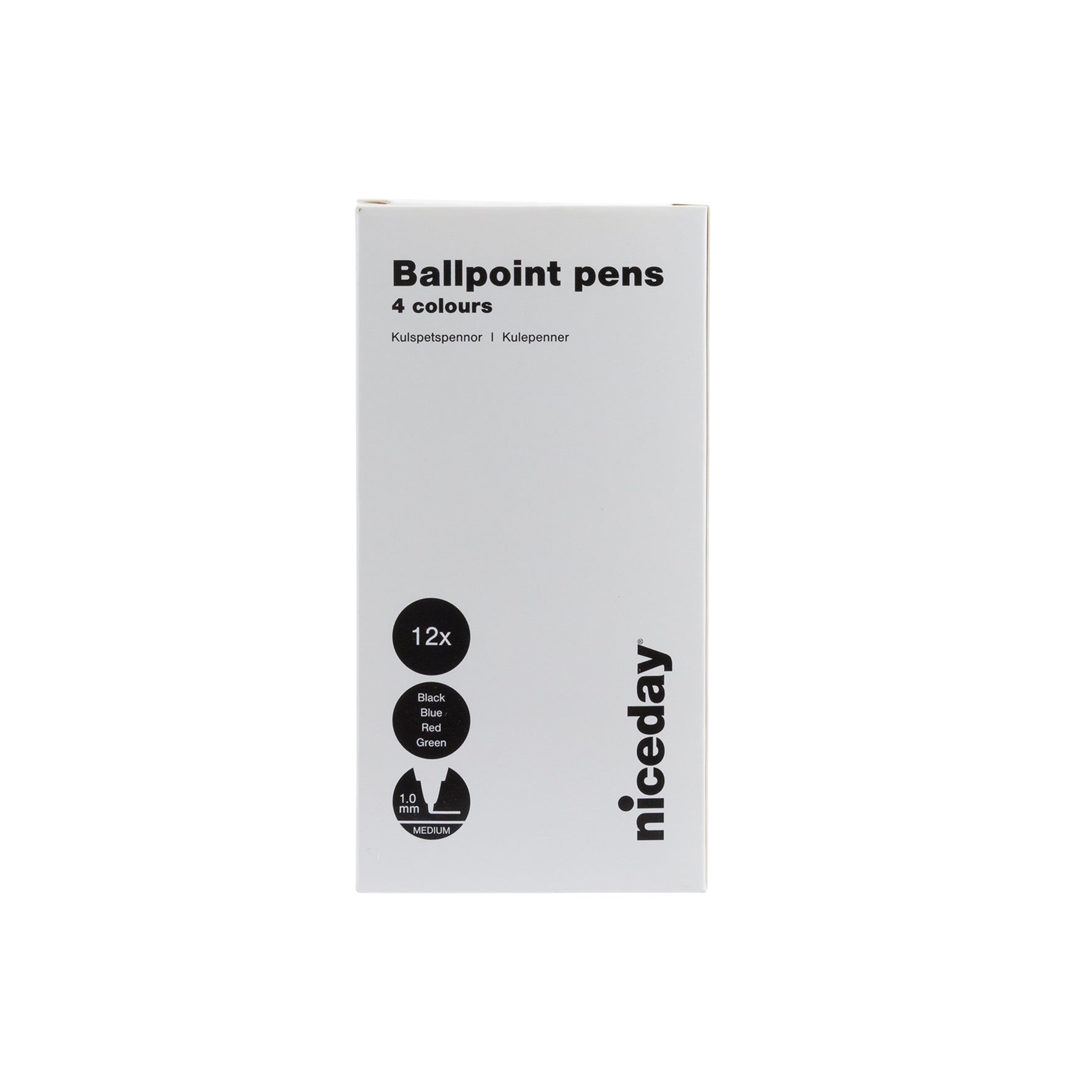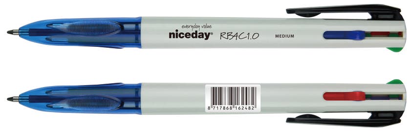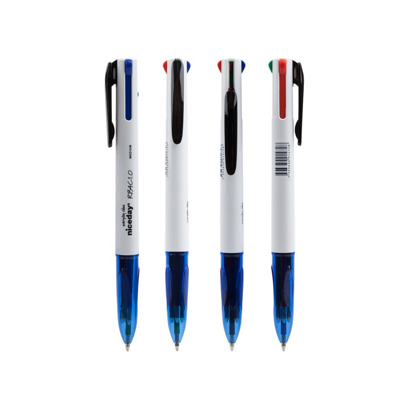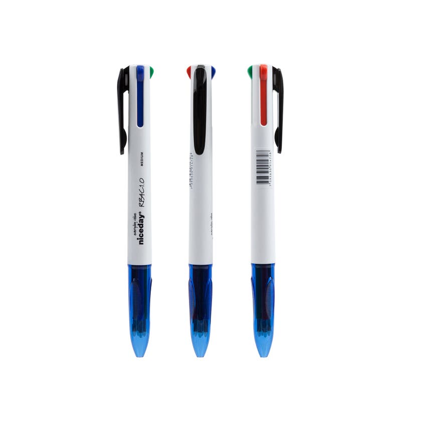 Flerfärgade kulspetspennan Niceday som skriver blått, rött, svart och grönt. Enkelt att ta med sig kulpennan då den har ett clips för fastsättning på blocket, i fickan eller väskan. Du är alltid beredd på att byta färg med ett enkelt klick när du har pennan i handen.