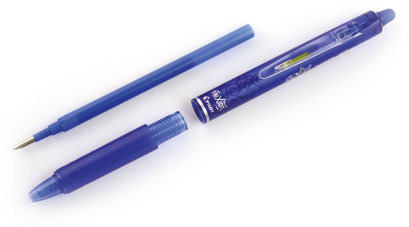 Raderbara kulpennan Pilot Frixion Clicker med klickmekanism. Kulspetspennan har ett mjukt gummigrepp och den skrivna texten kan raderas så många gånger man vill.