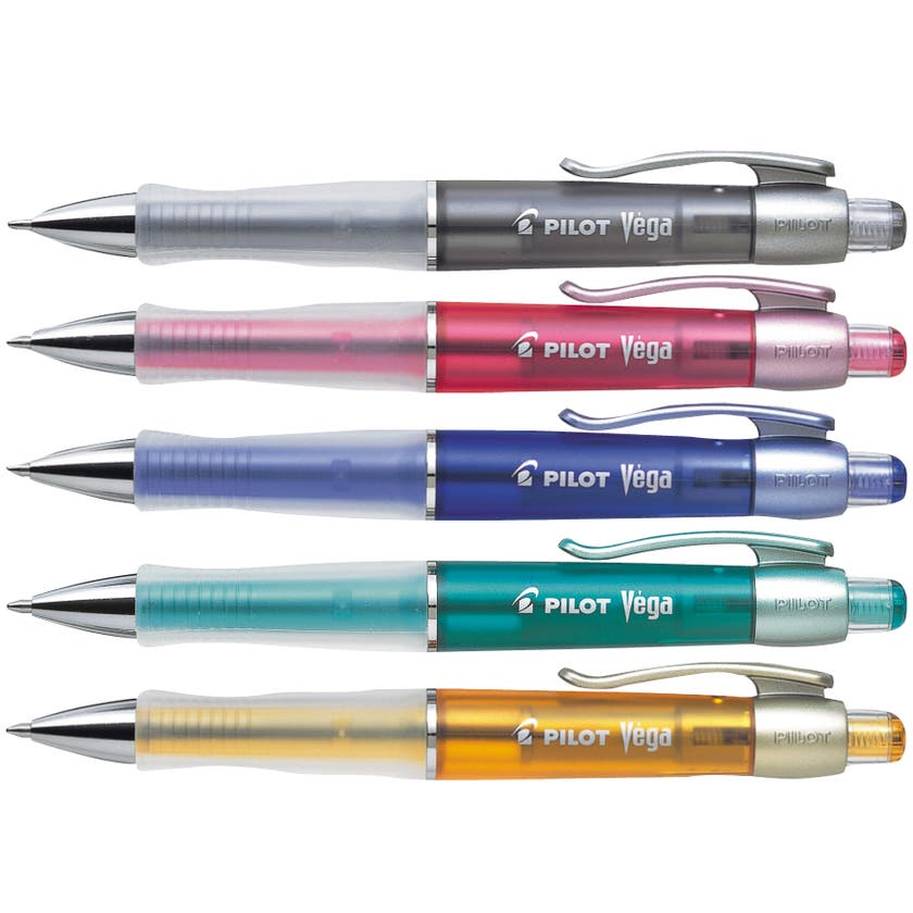 Kulspetspenna Pilot Vega med tjockt ergonomiskt gummigrepp som ger skön skrivkänsla. Vilket även ger en avlastning för fingrar och hand när du skriver mycket. Pennkroppen finns i fem tuffa, transparenta neonfärger.