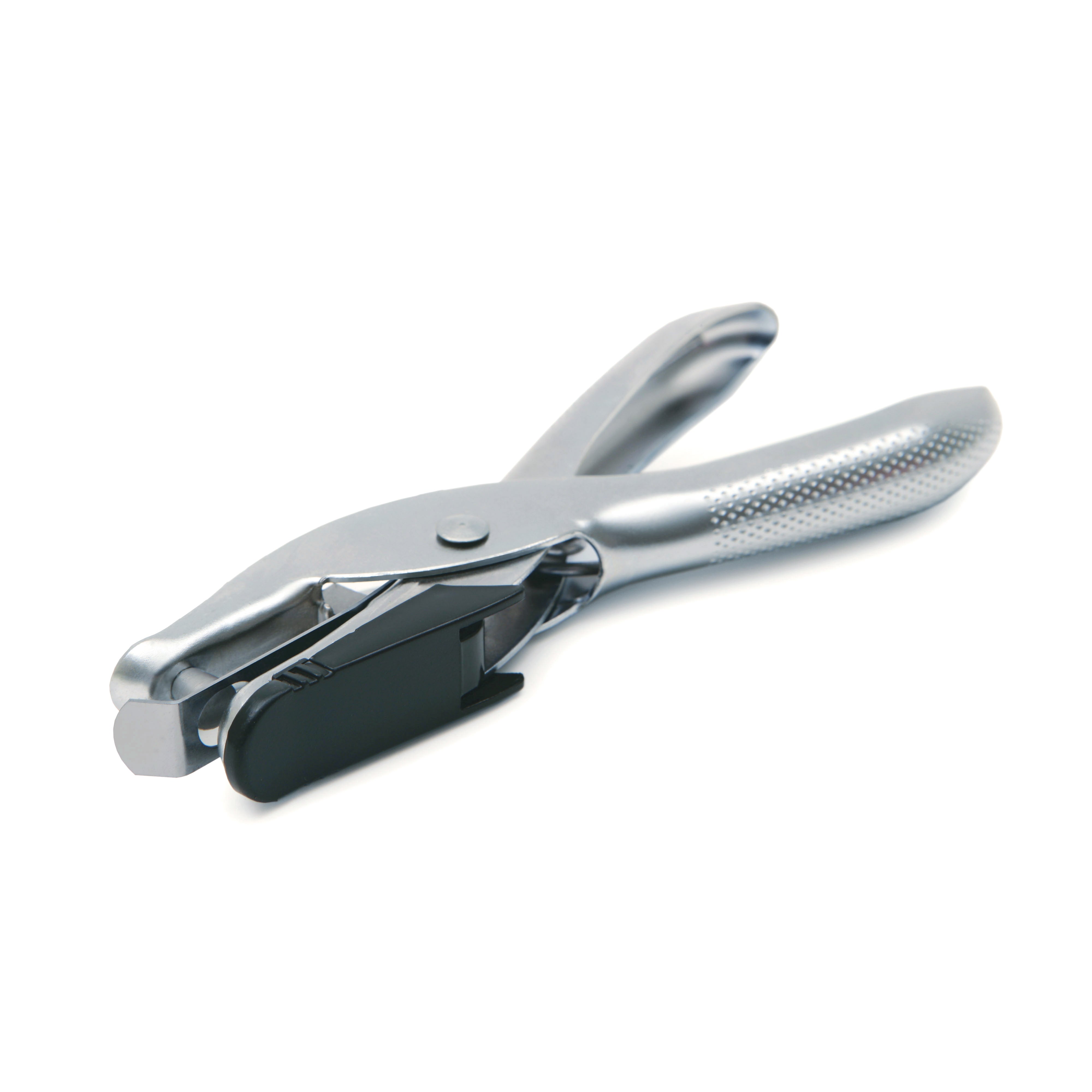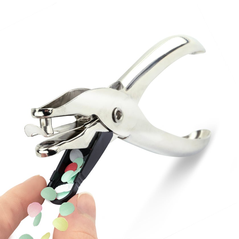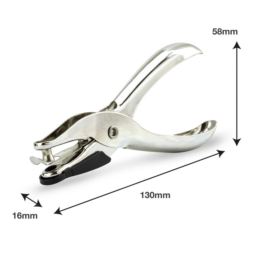 1-håls håltång i metall från Rapesco. Tången har kapacitet att stansa 10 ark på en gång, hålens diameter är 6 mm. Med pappersuppsamlare.