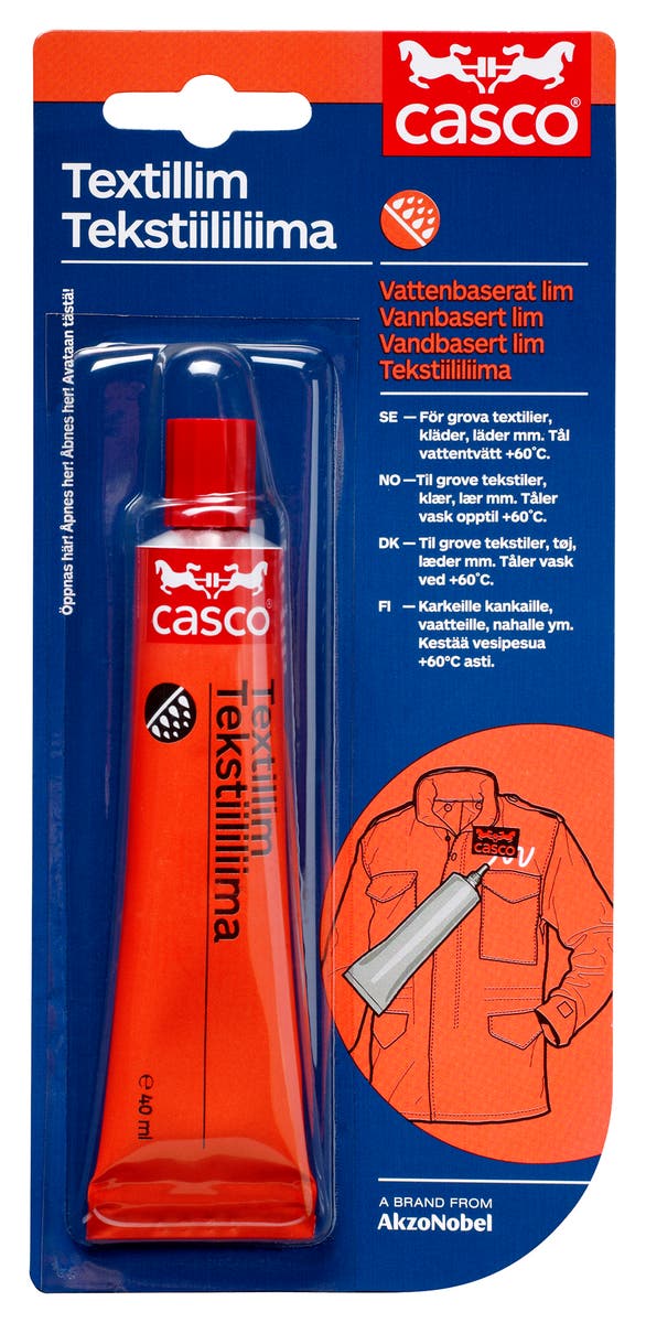 Casco textillim rekommenderas i första hand för limning av grova textilier och skinn, tex jeans, tält mm. Limfogen tål vattentvätt +60°, men ej kemtvätt. Limtuben som räddar din dag då olyckan är framme..