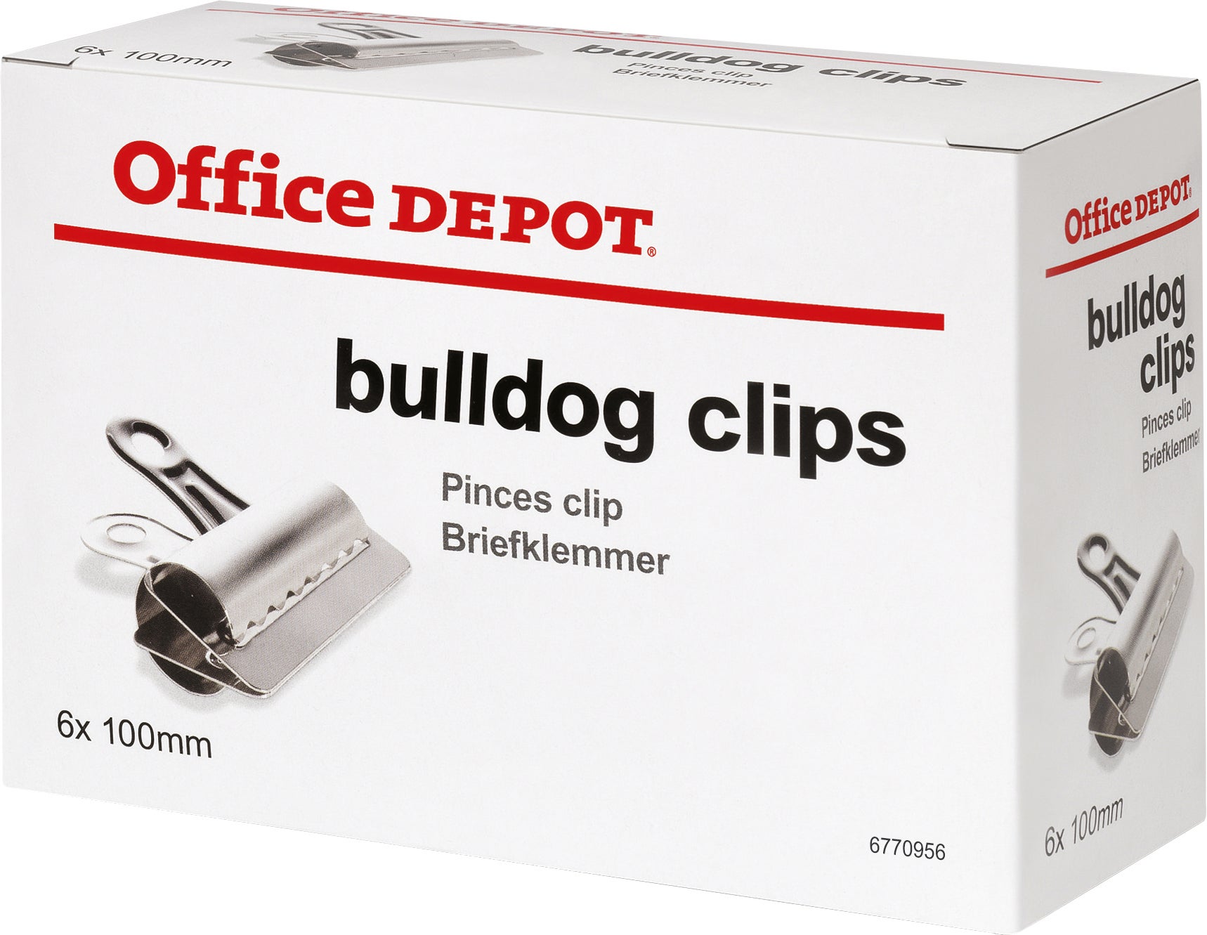 Pappersklämma Bulldog från Office Depot, är starka och breda pappersklämmor i metall. Hål för upphängning på anslagstavlan, på en krok på lämplig plats, mm.