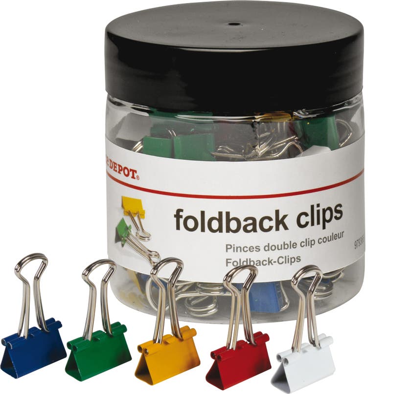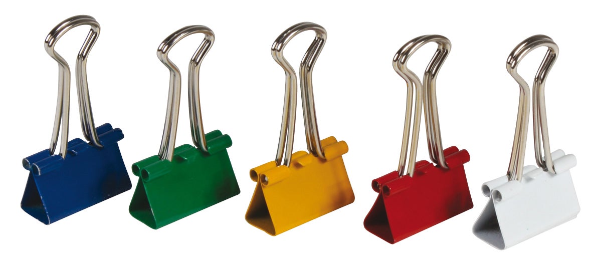 Pappersklämmor av bockad metall. Handtagen vikbara framåt för buntning, bakåt för upphängning. Blandade färger. 19 mm.