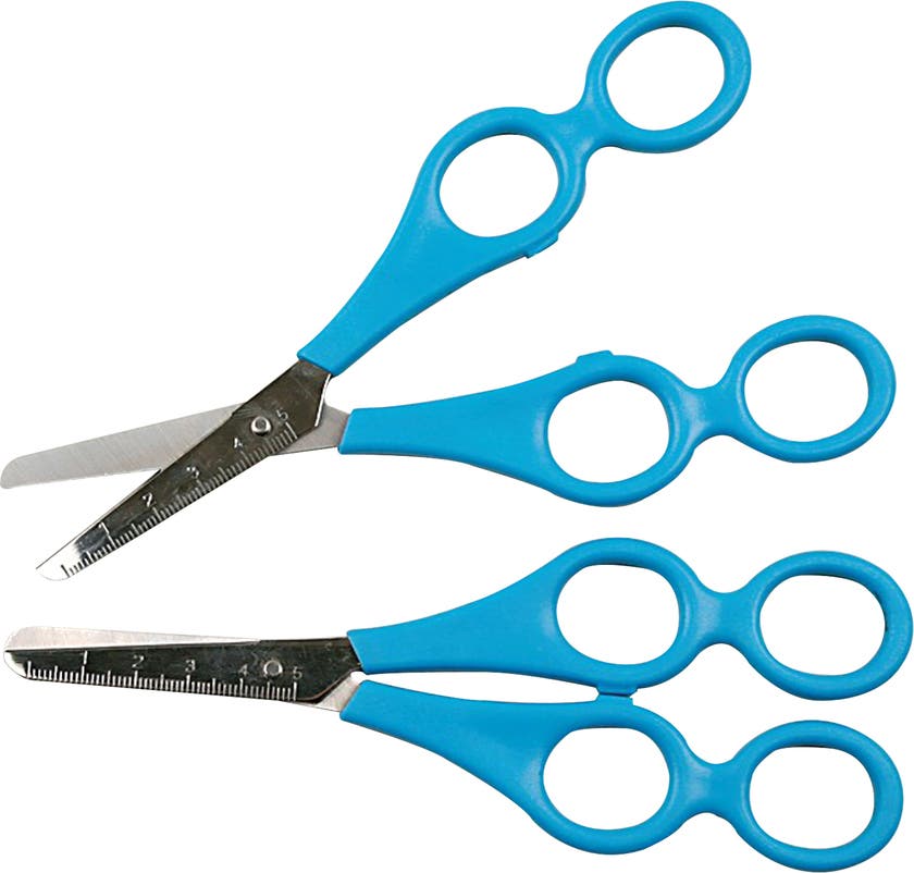 Hjälpsax med 4 ringar för tvåhandsfattning. För den som behöver extra hjälp med motoriken. Höger- och vänstersax. Med linjal.