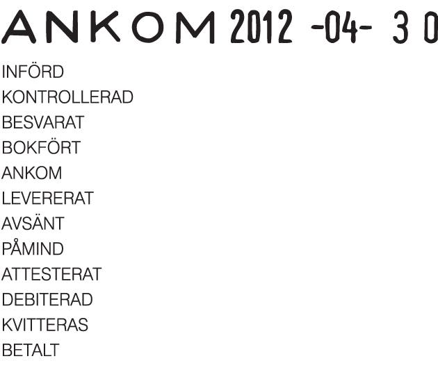 Datumstämpel med 12 vanligt förekommande texter. * ANKOM * BOKFÖRT * BESVARAT * KONTROLLERAD * INFÖRD * BETALT * KVITTERAS * DEBITERAD * ATTESTERAT * PÅMIND * AVSÄNT * LEVERERAT * ISO 11798 Certified * Miljöinfo: Tillverkad av återvunnet material (returplast)