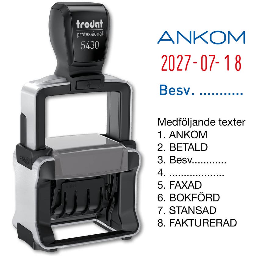Stämpel Trodat 5430 med datum och utbytbara texter. 4 mm texthöjd. Enkelt att byta den inbyggda dynkassetten. Stativ av metall med datum och utbytbara texter av gummi på nylonväv. Täcker in år 2024–2035.
