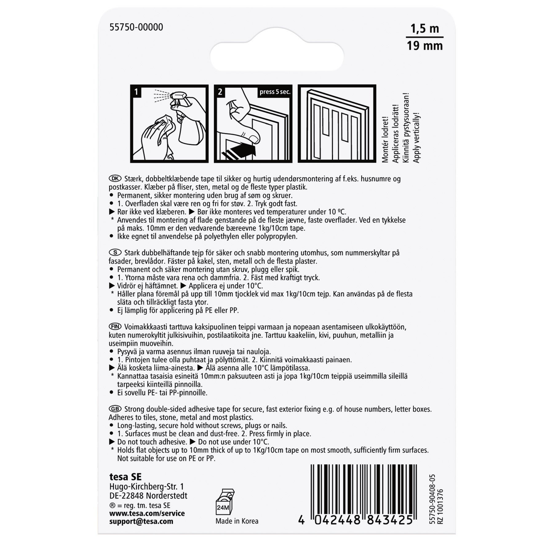 Powerbond® Outdoor från Tesa är en dubbelhäftande monteringstejp framtagen för utomhusbruk. Tejpen är enkel att använda och det behövs inga verktyg förutom en sax. Ett permanent, starkt grepp som under optimala förhållanden innebär att en enda 10 cm lång tejpremsa kan hålla upp till 1 kg. Den dubbelhäftande monteringstejpen är perfekt för att fixera saker som exempelvis husnummer på fasta ytor, fungerar såväl inomhus som utomhus.