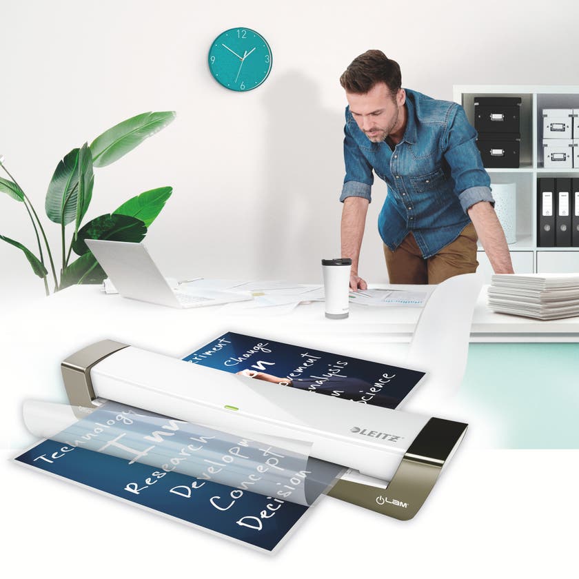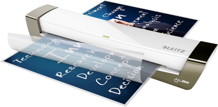 Leitz iLAM Office A3 är en kompakt och snabb lamineringsmaskin som är idealisk för det lilla kontoret. Problemfri laminering med utmärkta resultat, inga komplicerade inställningar. Med en uppvärmningstid på endast 60 sekunder är den perfekt när man laminerar sällan. Låg energiförbrukning, automatisk avstängning när enheten inte används under 30 minuter. Det tar ungefär 45 sekunder att laminera ett A4 ark med 80 mikron laminat. För att uppnå bästa resultat bör du rengöra lamineringsmaskinen regelbundet med rengöringsark (säljs separat). Rengöringsarken tar bort limrester och annat oönskat material från valsarna i lamineringsmaskinen.