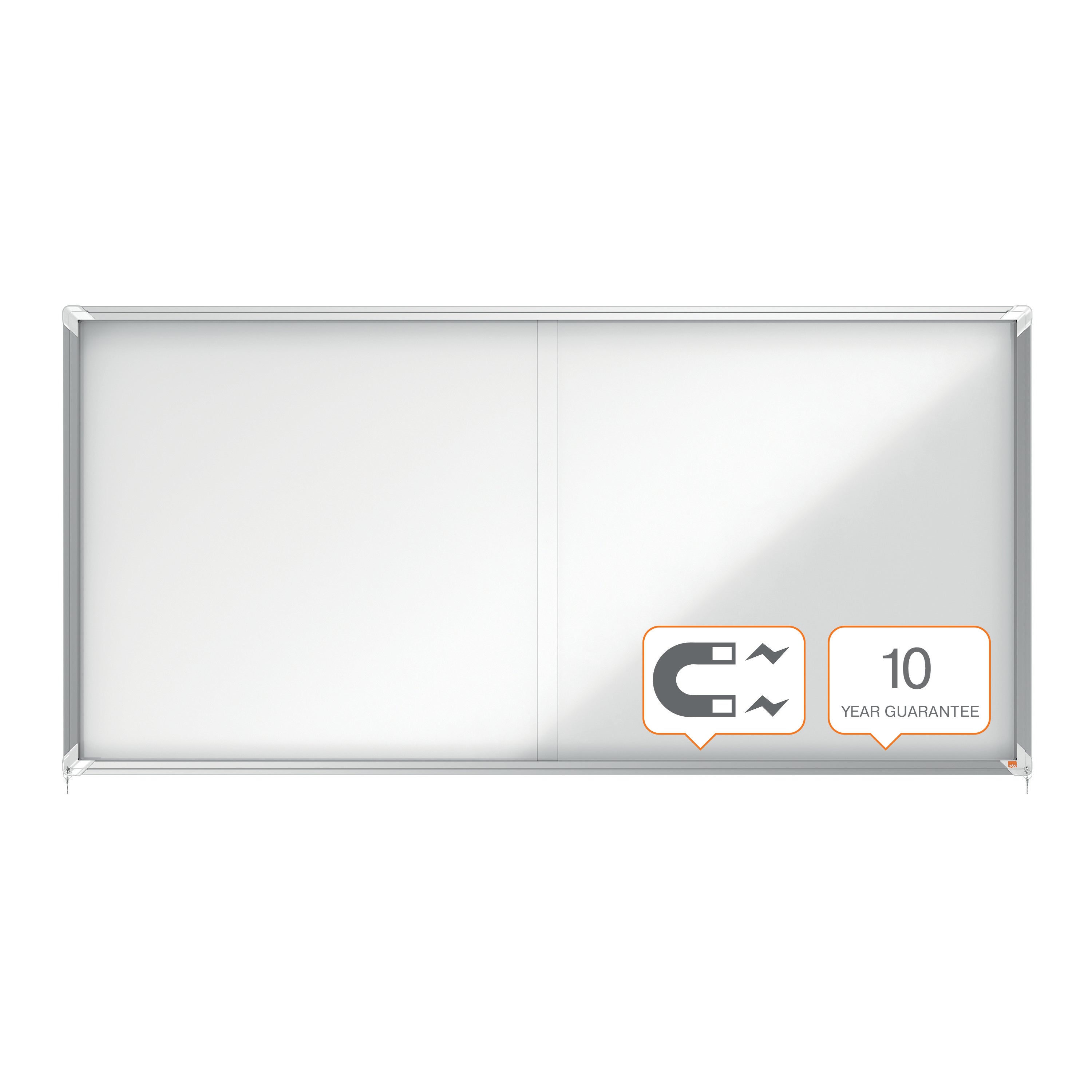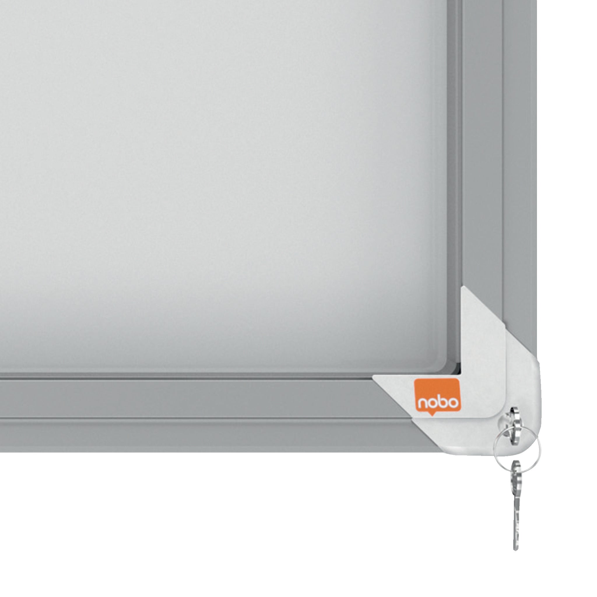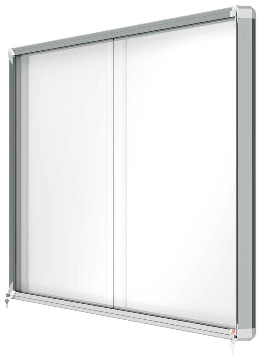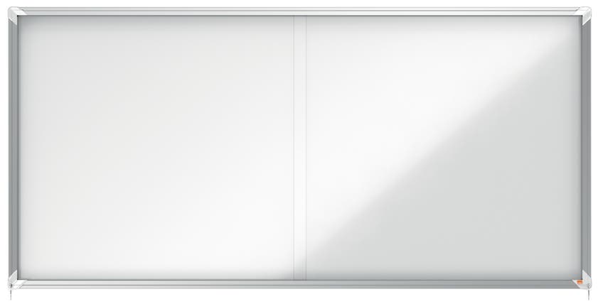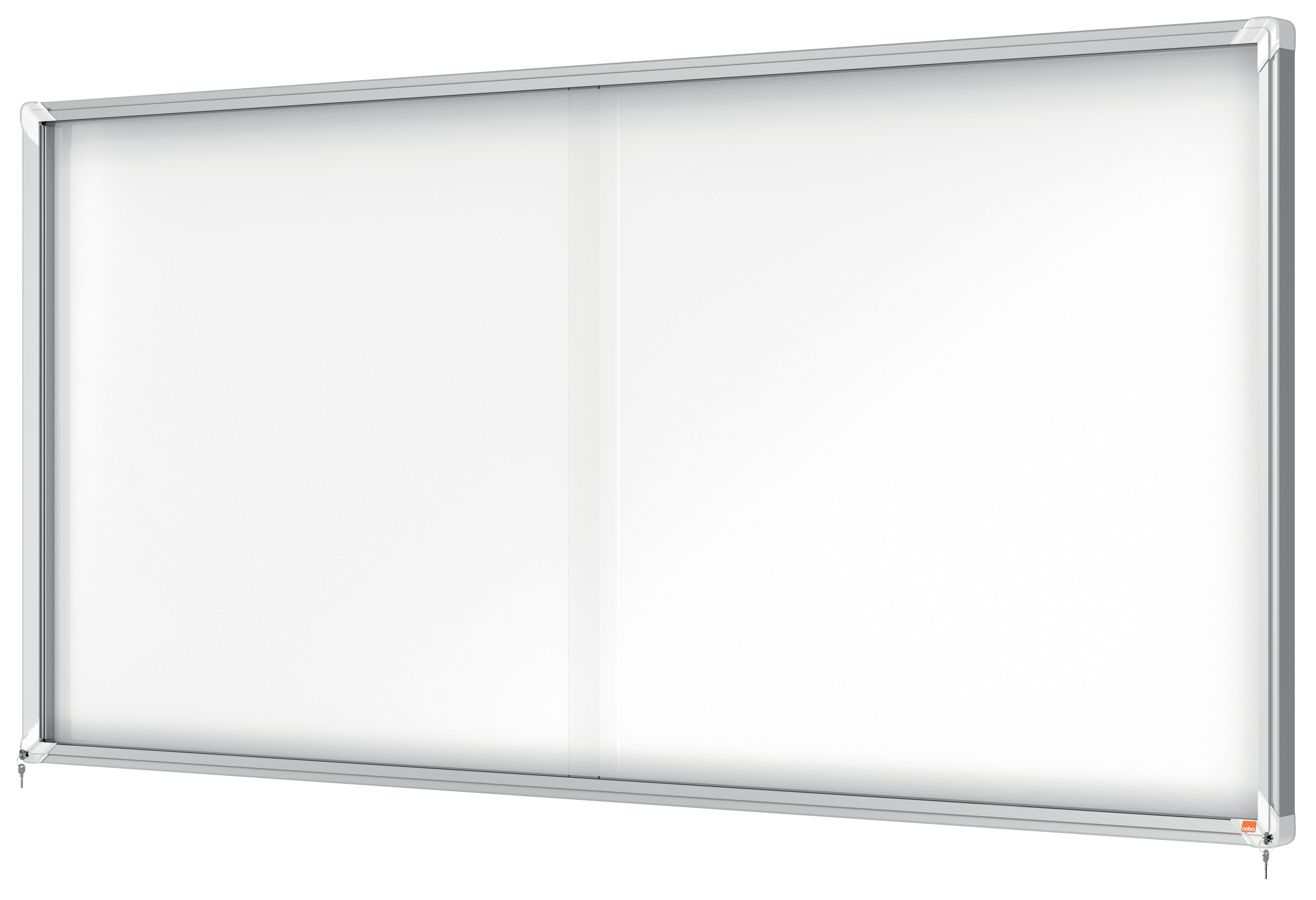 Anslagstavla låsbar med skjutdörr och magnetisk. Magnetiskt låsbart anslagstavla med skjutbara glasdörrar och diskret integrerat hörnlås. Komplett med en modern snygg aluminiumlist och fixerad med en skena och genom hörnväggmontering. Utmärkt magnetisk anslagstavla för att säkert visa dina meddelanden.