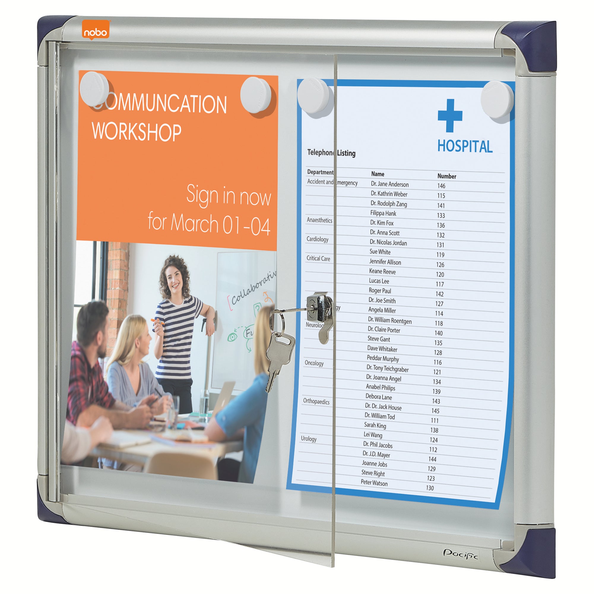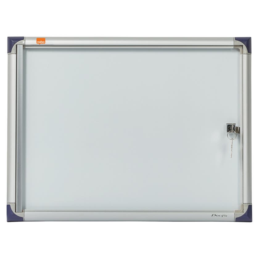 Nobo anslagstavla låsbar tunn magnetisk. Extra tunn låsbar glastavla för internt bruk. Perfekt i korridorer och där utrymmet är begränsat. Vit whiteboardyta för anteckningar och visning av dokument med magneter. Designad för säker visning av ett antal x A4-dokument. Levereras med väggfästen.