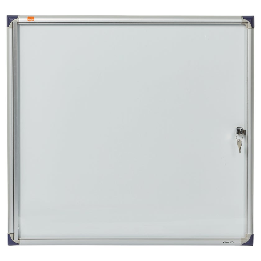 Nobo anslagstavla låsbar tunn magnetisk. Extra tunn låsbar glastavla för internt bruk. Perfekt i korridorer och där utrymmet är begränsat. Vit whiteboardyta för anteckningar och visning av dokument med magneter. Designad för säker visning av ett antal x A4-dokument. Levereras med väggfästen.