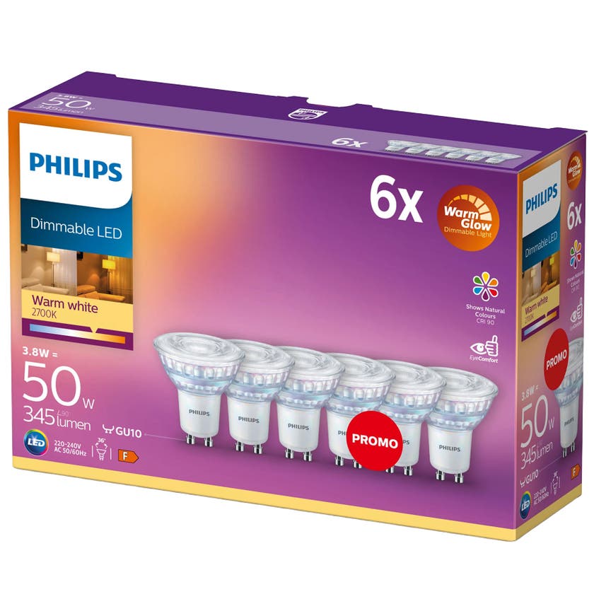 Med Philips WarmGlow LED GU10 kan du skapa en varm och trivsam belysning – ju mer du dimrar, desto varmare blir ljuset. Lamporna återger färger naturligt (CRI 90) och passar utmärkt både som mysig accentbelysning och klar allmänbelysning.
