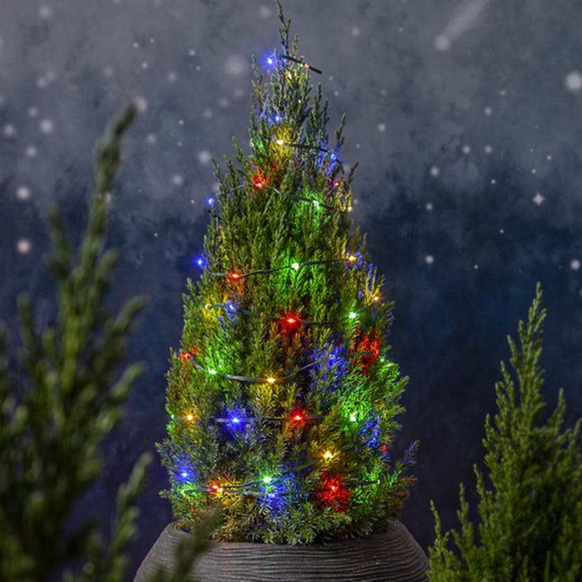 Kopplingsbar ljusslinga Dew Drop en tunn och platt slinga som är perfekt utnformad för att ge liv till buskar och träd under de mörka månaderna. En grön eller transparent kabel som är anpassad för utomhusbruk.