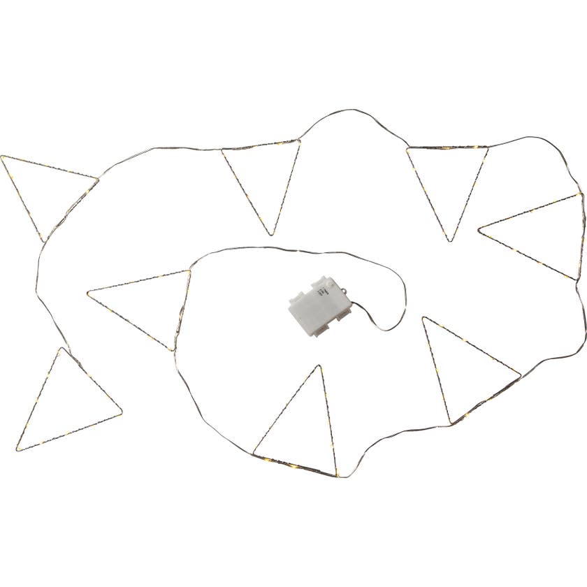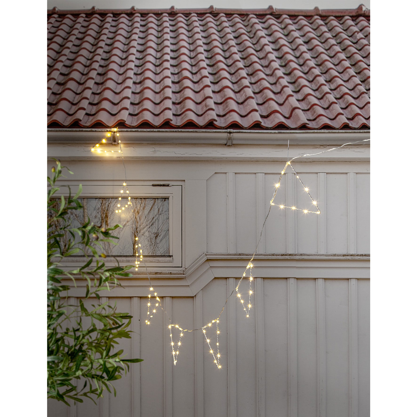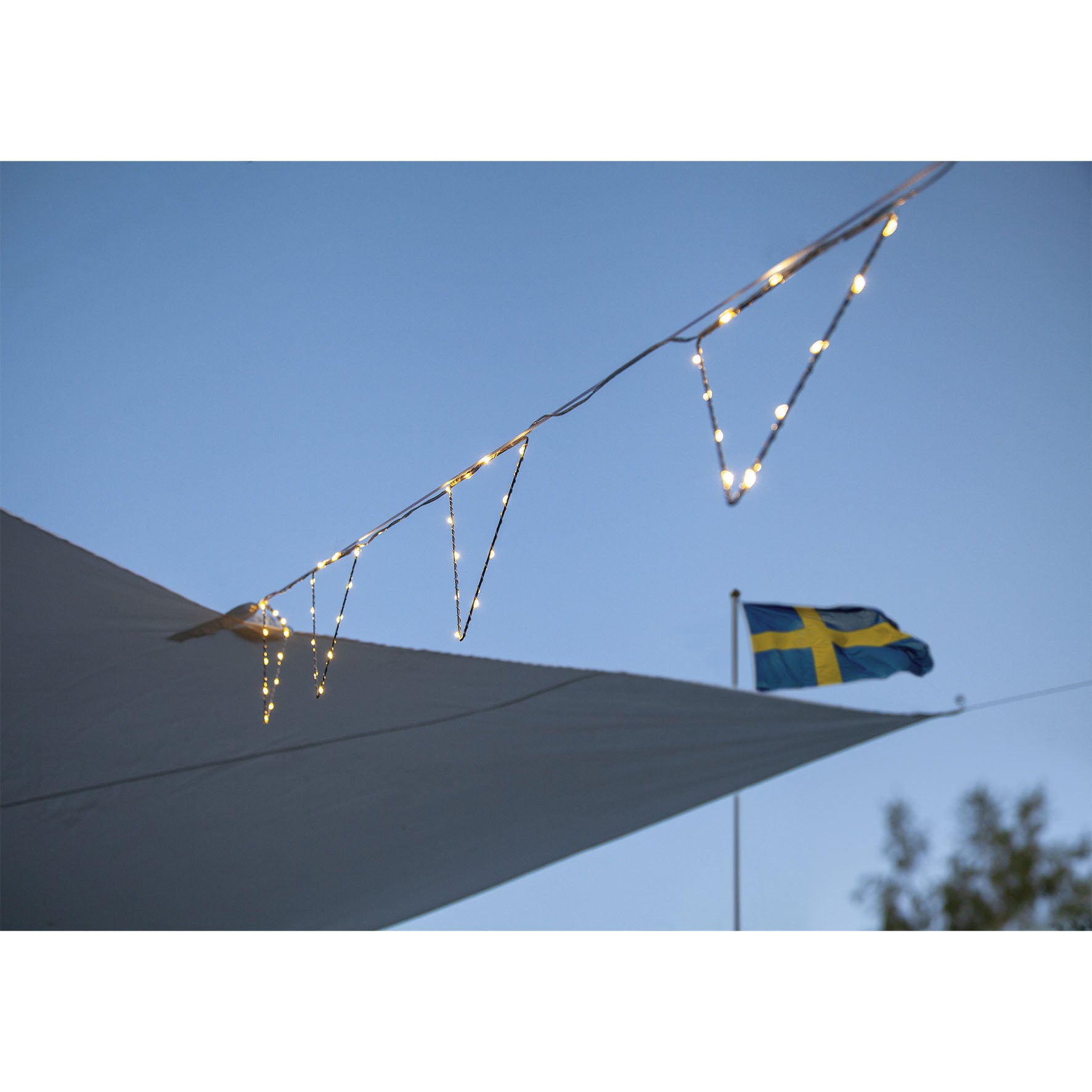 Penny är en dekorativ ljusslinga med silverfärgade metallvimplar. Varje vimpel har en dew drop-slinga med 11 varmvita ljuspunkter virad runt ramen. Med en total längd på 240 cm och ett avstånd på 20 cm mellan varje ljuskälla sprider Penny sitt ljus jämnt och vackert. Drivs med 3xAA-batterier (säljs separat). Ljusslingan ger upp till 80 timmars brinntid. Penny passar utmärkt både till vardags och fest. Batteridosa för utomhusbruk. Timerfunktion.