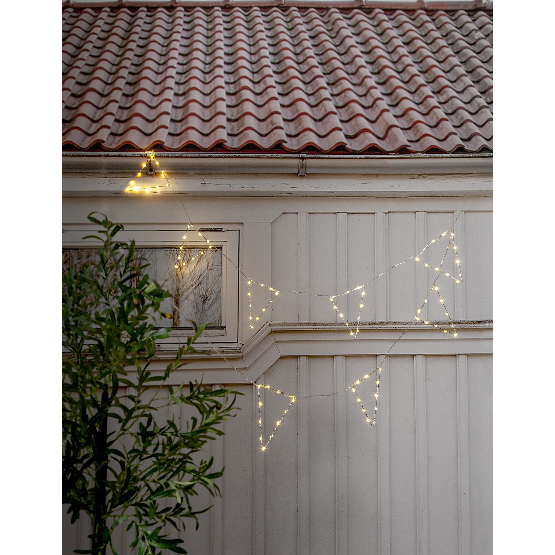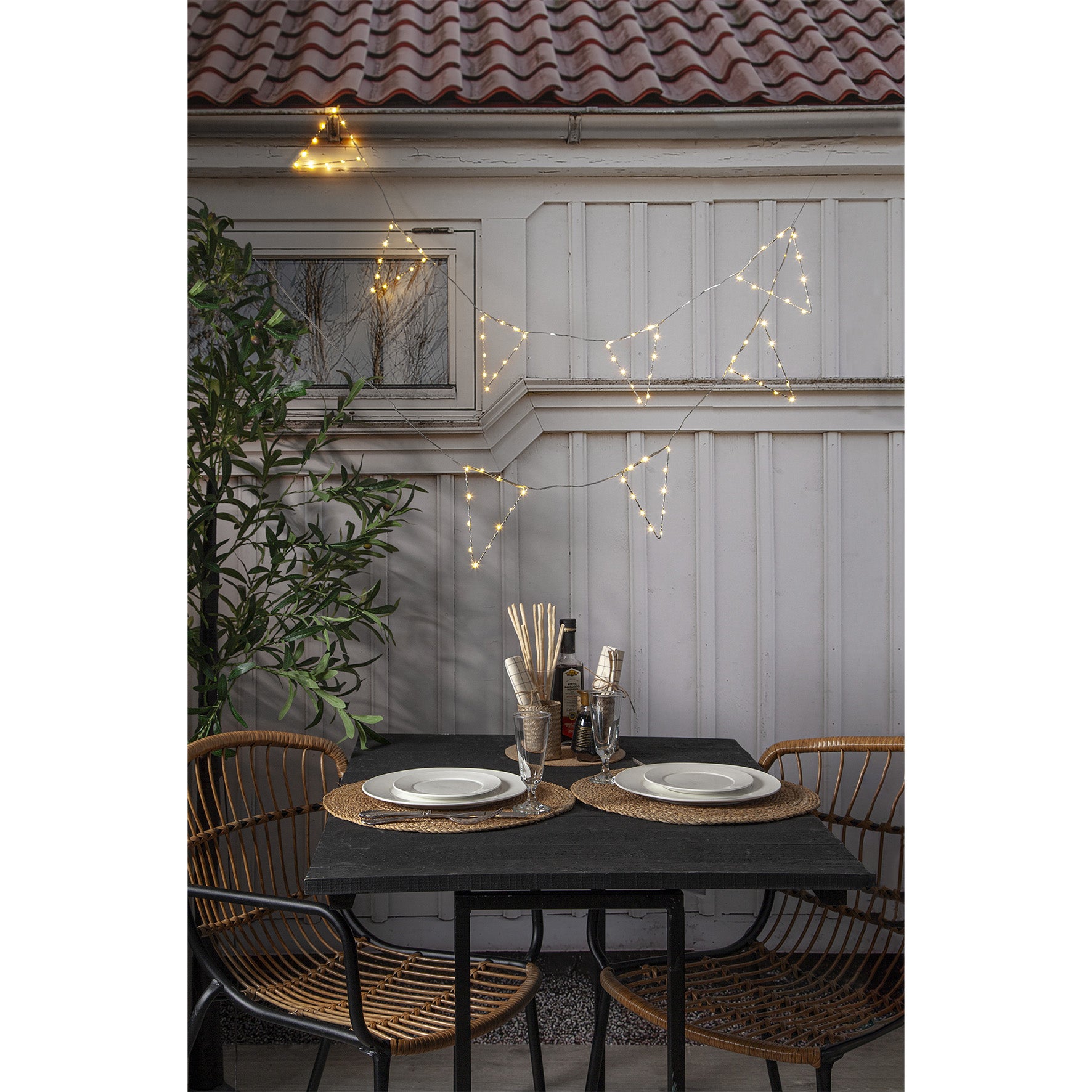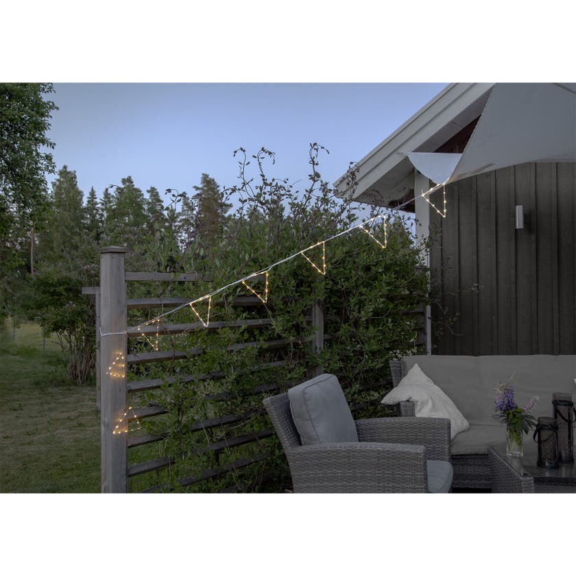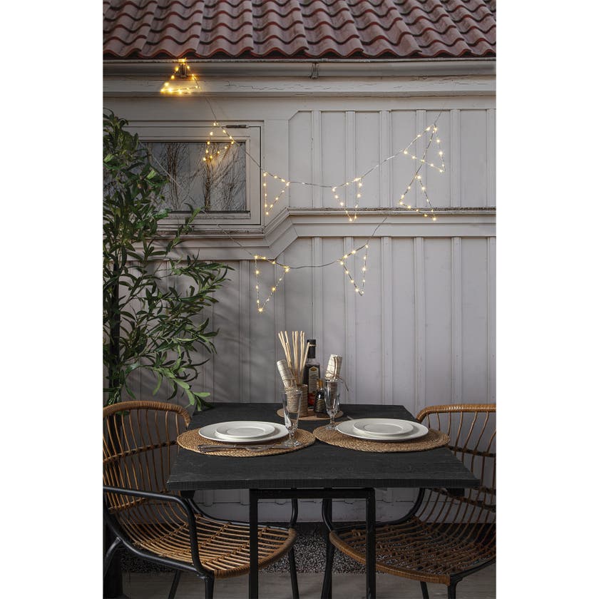 Penny är en dekorativ ljusslinga med silverfärgade metallvimplar. Varje vimpel har en dew drop-slinga med 11 varmvita ljuspunkter virad runt ramen. Med en total längd på 240 cm och ett avstånd på 20 cm mellan varje ljuskälla sprider Penny sitt ljus jämnt och vackert. Drivs med 3xAA-batterier (säljs separat). Ljusslingan ger upp till 80 timmars brinntid. Penny passar utmärkt både till vardags och fest. Batteridosa för utomhusbruk. Timerfunktion.