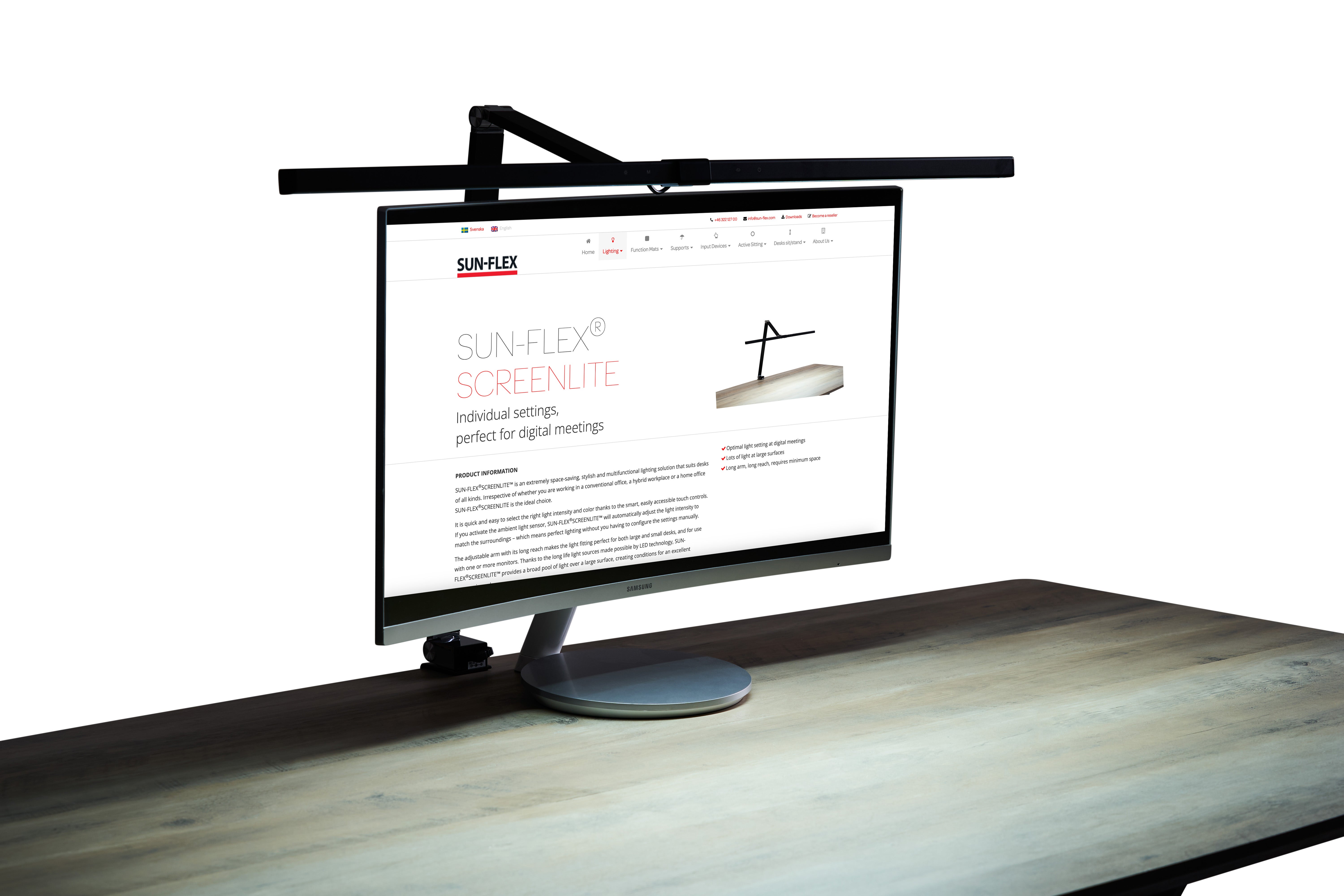 Digitala möten – Arbetar man via digitala möten använder man enkelt SUN-FLEX®SCREENLITE™ som ljusförstärkare genom att vinkla upp den långa ljuskällan. Detta ökar skärpan och kontrasten vilket ger bättre kvalitet på möten. Smart belysning.