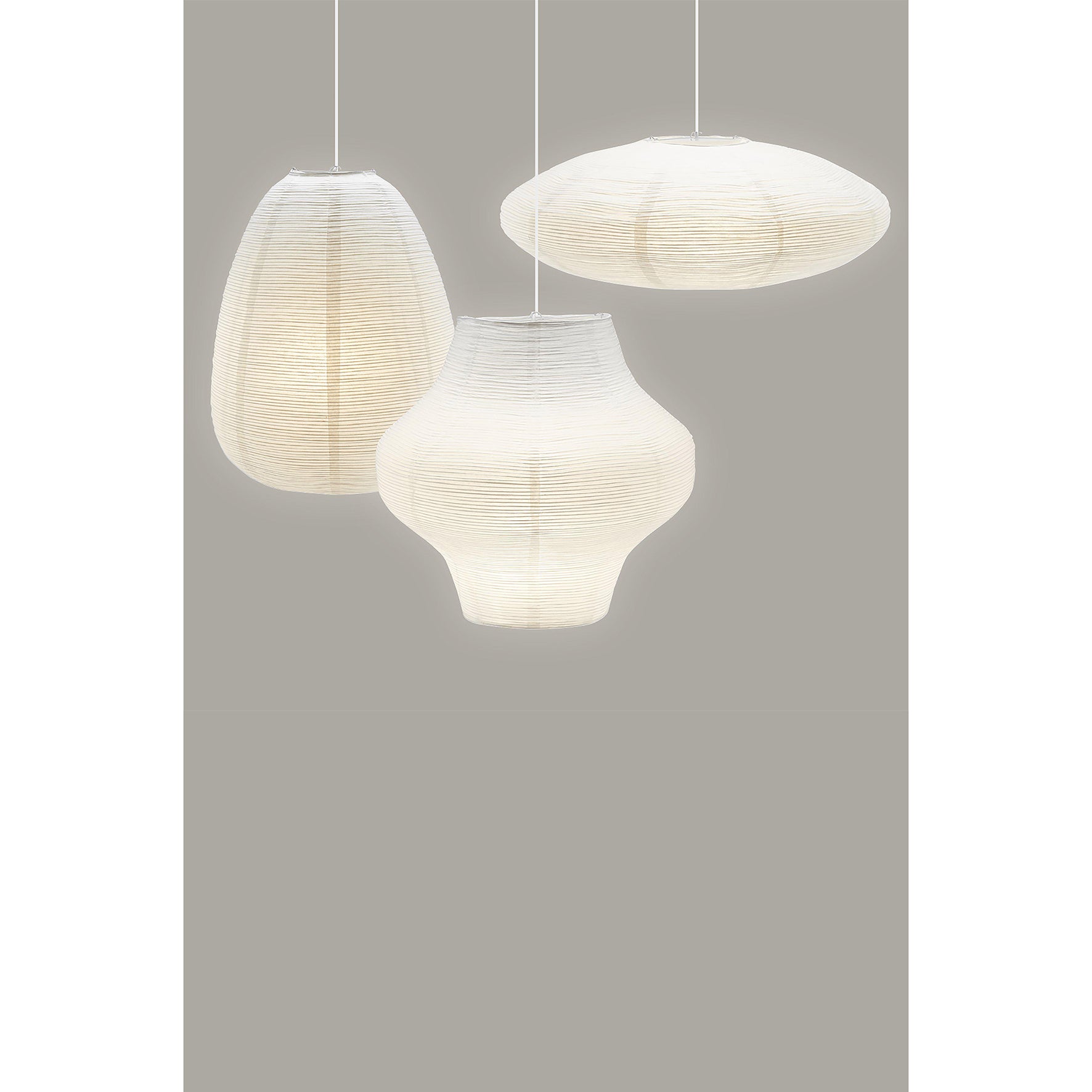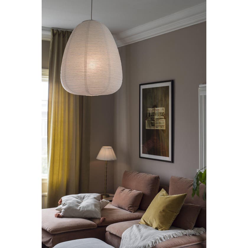 Takskärm / Taklampa Maki vit Ø430 mm. Rispappersskärm Maki med tät oregelbunden metalltråd som skapar ett vackert mönster. Maki är äggformad.