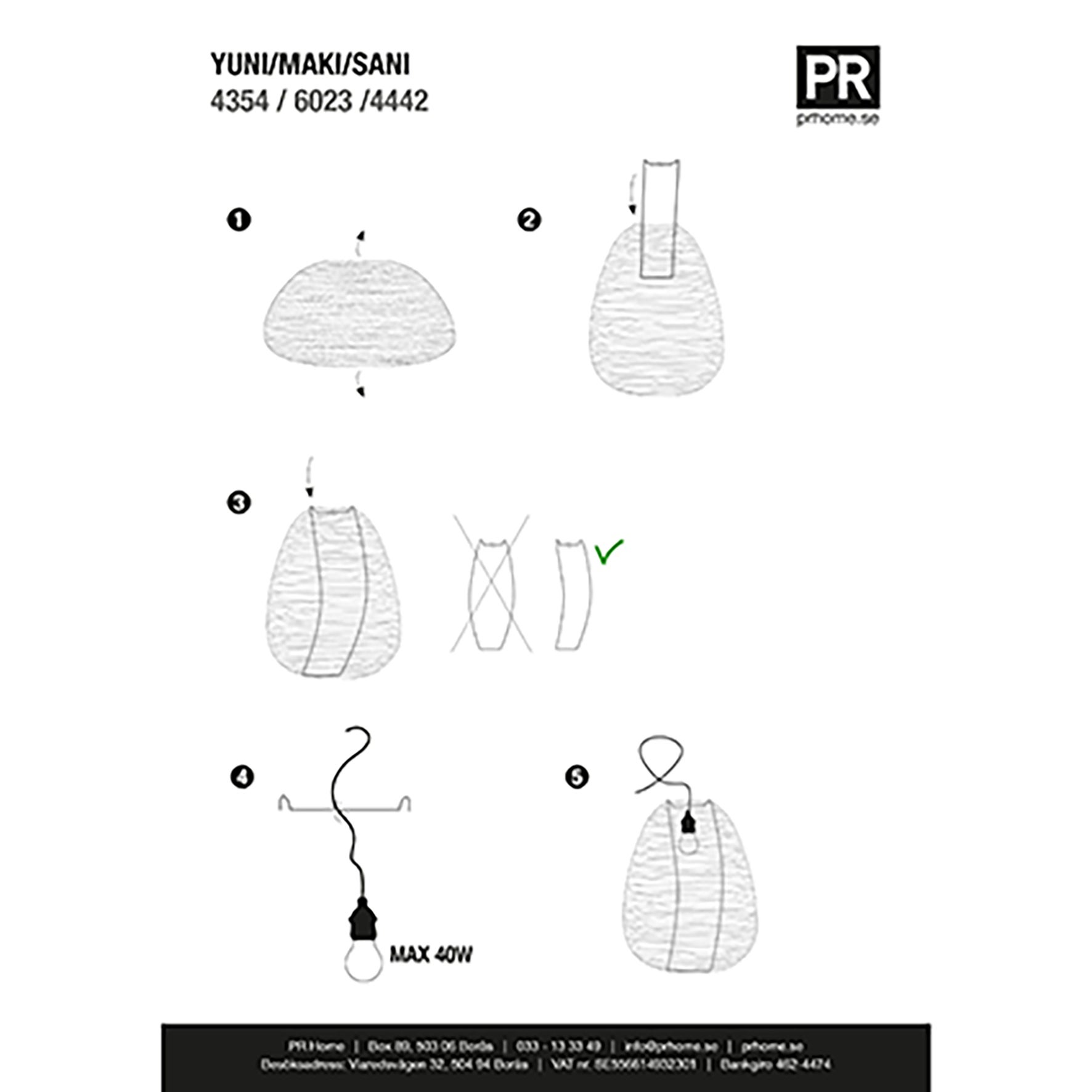 Levereras utan lampsladd. Spänns ut till sin form med hjälp av en metallexpander som man även fäster lampsladden i.