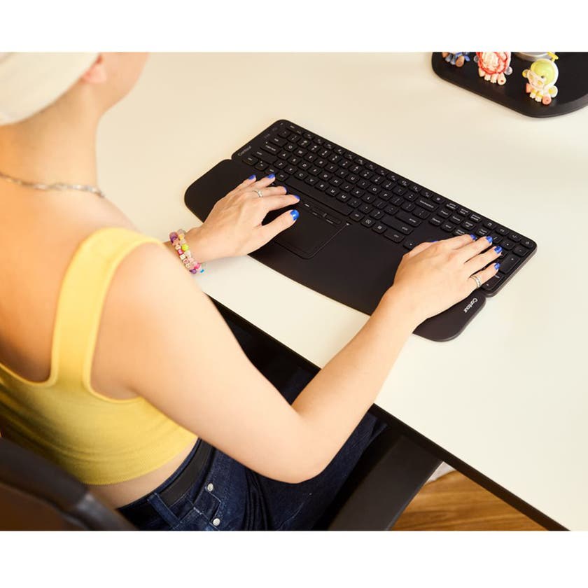 Det rymliga handledsstödet ger stabilt stöd för både hand och handled, med en mjuk yta som ger en naturlig övergång mellan tangentbord och mus.