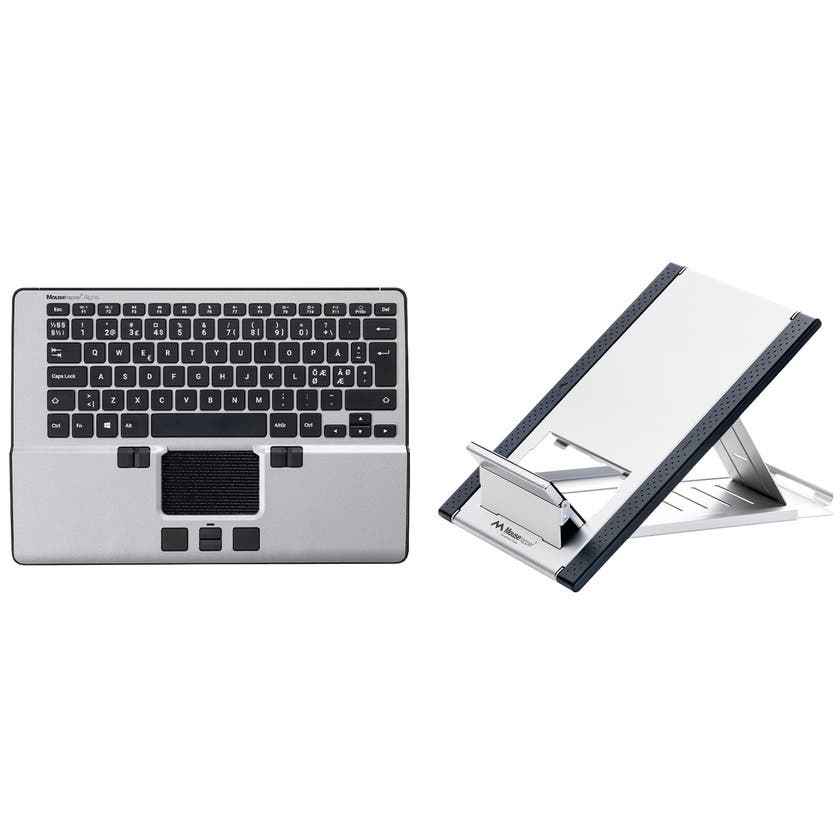 Mousetrapper Alpha + laptopställ – din kompletta ergonomiska arbetsstation. Mousetrapper Alpha är världens första centrerade pekdon med inbyggt fullstort tangentbord och hela 19 programmerbara knappar. Kombinerat med det justerbara stället för laptop/surfplatta/iPad får du optimal ergonomi, smidig anpassning av arbetsposition och lång batteritid. Optimera arbetsställning, produktivitet och välmående med denna ergonomiska kombination!