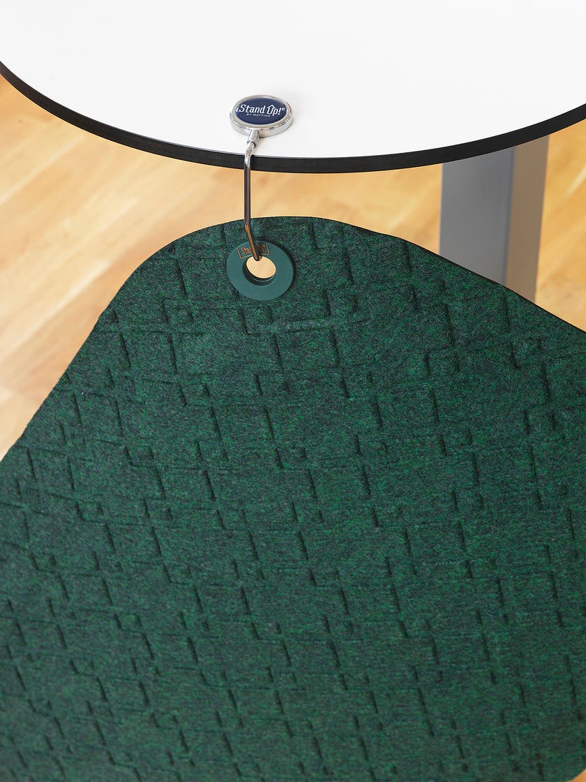 Placerar kroken på skrivbordskanten och häng upp din ståmatta i hålet. Städningen utav golvet går snabbare, enklare och renare, när arbetsplatsmattan hänger på sin krok.