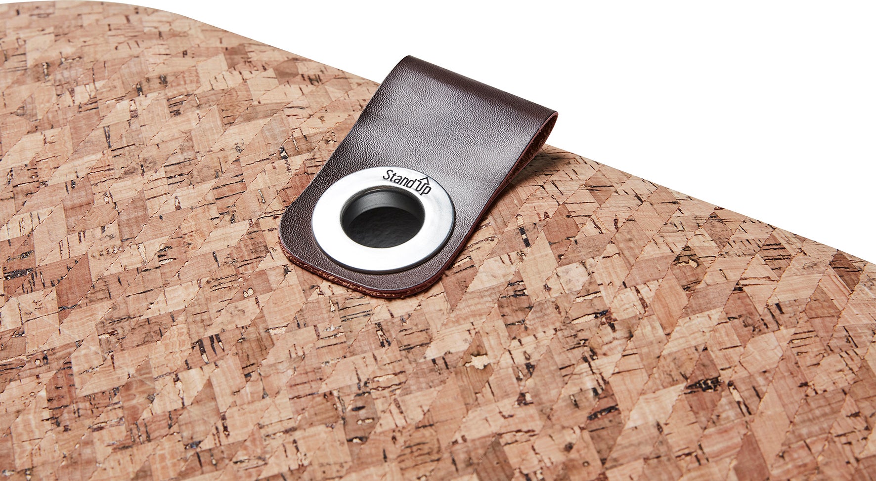 Öljett i borstad metall gör det möjligt att hänga upp mattan vid rengöring eller när den inte används. Mattan har fasade kanter som minskar risken för att snubbla. StandUp Cork är bekväm att stå på både med och utan skor.
