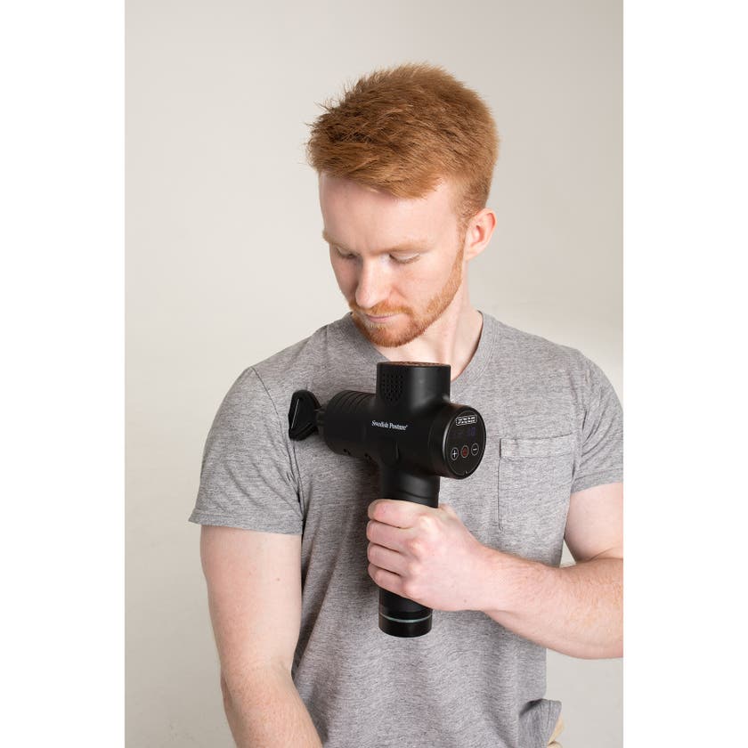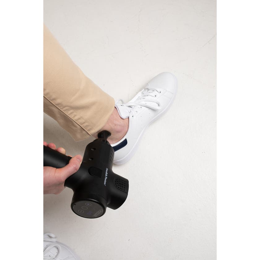 Massagepistolen är perfekt för hemmabruk och är en effektiv metod för behandling av smärta i mjukvävnad. Det stimulerar dess proprioceptiva funktion och lindrar därmed effektivt muskelspänningar.