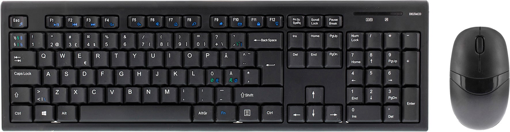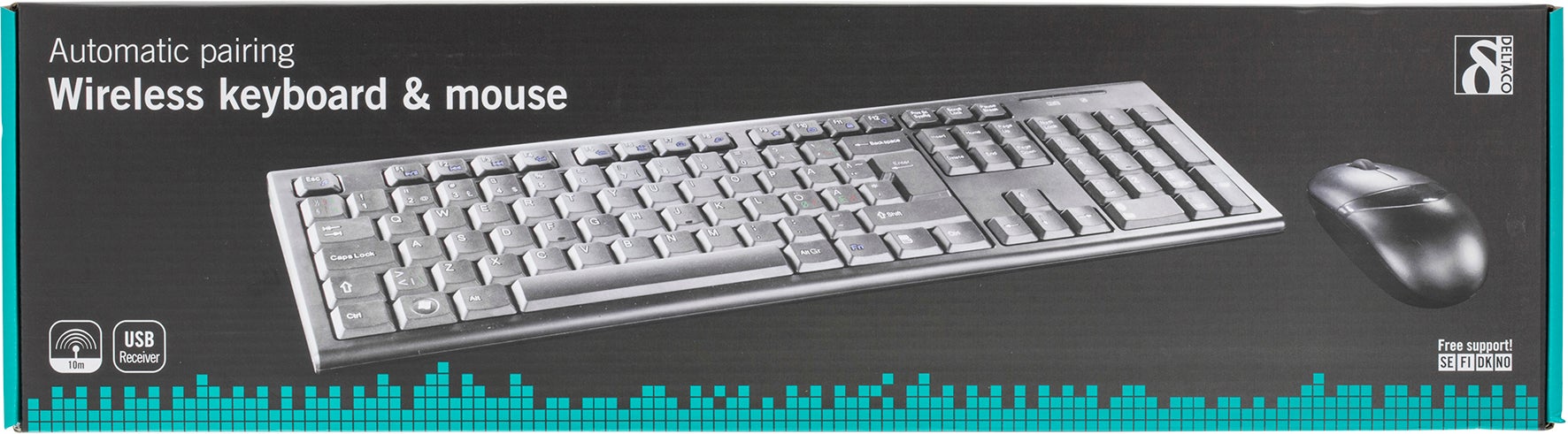 Deltaco trådlösa tangentbord och mus TB-114, 105 tangenter, nordisk layout, 2.4GHz USB nano mottagare. Trådlöst tangentbord och optisk mus med 3 knappar med scroll. Med automatisk parning behöver du bara ansluta USB-adaptern i önskat uttag i datorn för att få allt att fungera.