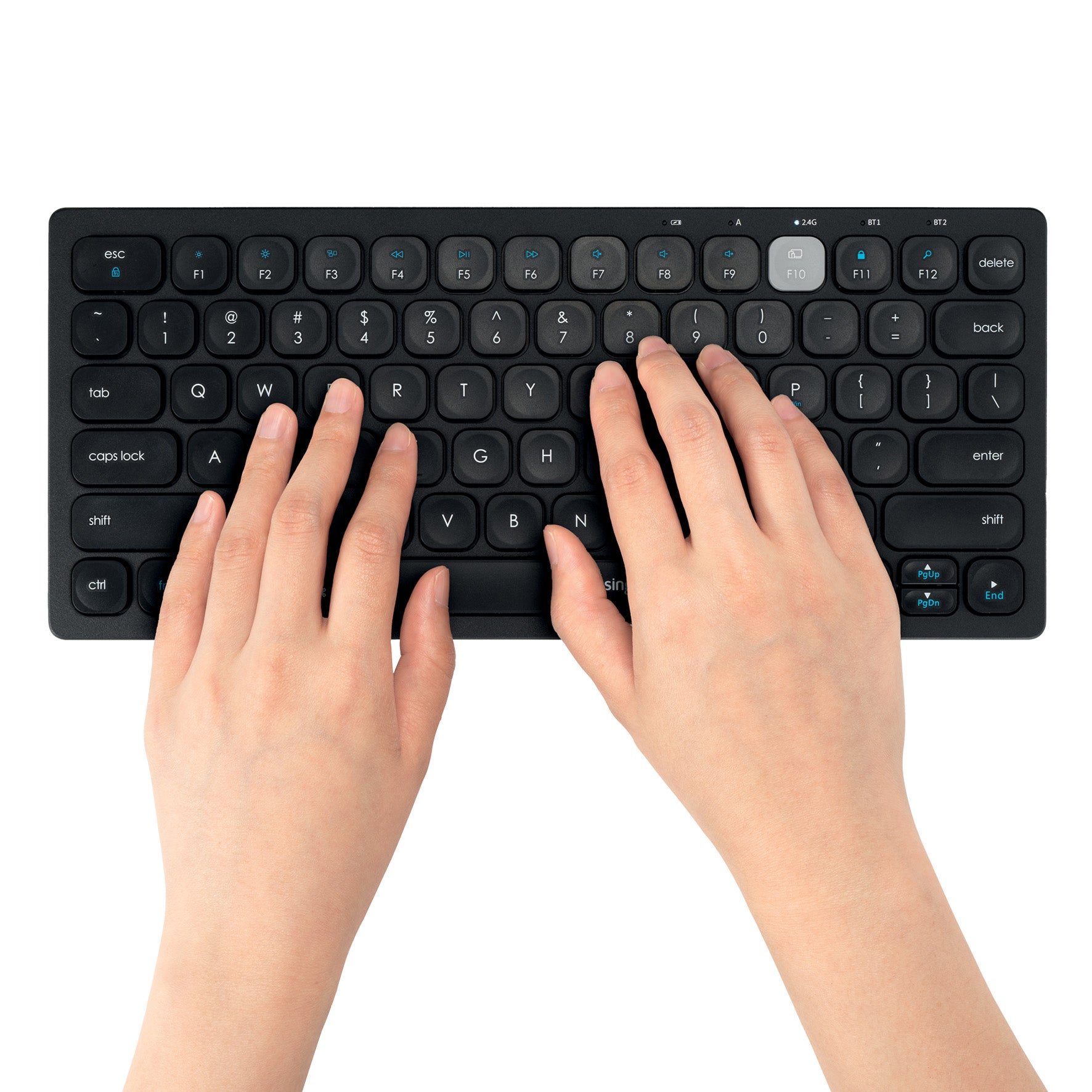 Dual Wireless Compact är ett trådlöst tangentbord som låter dig ansluta och växla mellan upp till tre enheter åt gången (dator, surfplatta eller telefon) med Bluetooth (3.0 eller 5.0) eller 2.4GHz trådlöst med 128-bitars AES-kryptering. Tangenterna är släta och lyhörda, samt inkluderar multimediakommandon. Windows, macOS, iOS och Chrome OS-kompatibelt. Indikator för lågt batteri. Inkluderar två AAA-batterier. Tre års garanti.