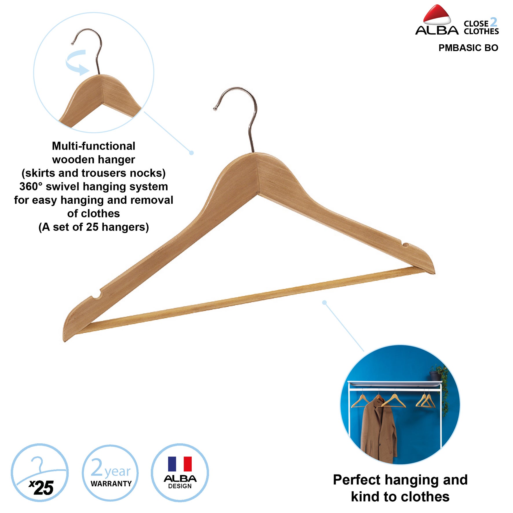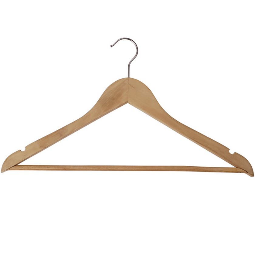 Denna ergonomiskt utformade trägalge är perfekt formad med mjukt böjda linjer vid axlarna, vilket hjälper till att bevara plaggens passform och motverka oönskade märken eller deformation. Den roterbara 360°-kroken gör det enkelt att hänga in och ta ut kläder, oavsett åt vilket håll galgen är vänd.