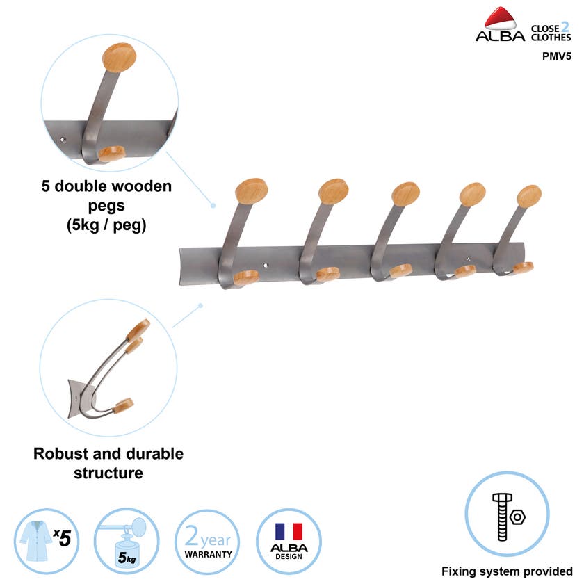 Denna eleganta väggklädhängare är ett praktiskt val för arbetsplatser, receptioner och andra offentliga eller gemensamma miljöer där många behöver kunna hänga av sig ytterkläder. Den robusta stålkonstruktionen kombineras med fem dubbla träkrokar som ger gott om plats för jackor, väskor och accessoarer.