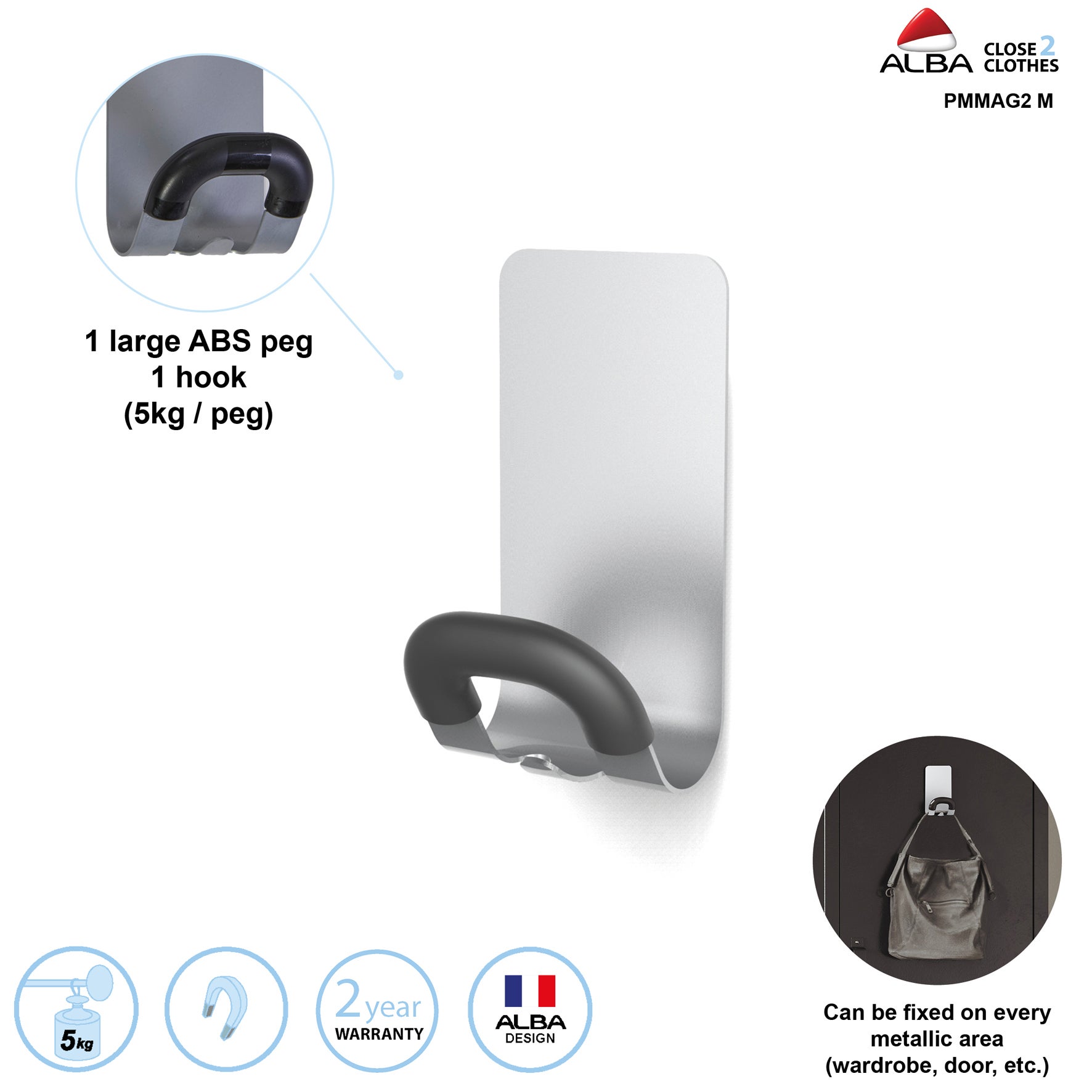 Denna stilrena krok är en praktisk lösning för kontor, receptioner och andra arbetsmiljöer där det behövs extra upphängningsmöjligheter utan att skada väggar eller inredning. Den kraftfulla magneten och den robusta stålkonstruktionen ger ett pålitligt fäste på metalliska ytor, helt utan borrning.