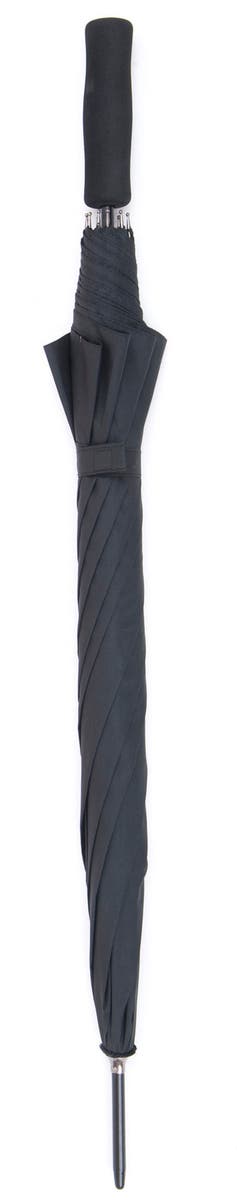 Långt uppfällbart paraply som ska ge skydd mot regn och även mot solen.