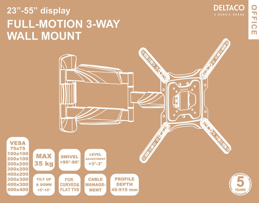 Elegant fullt-artikulerande väggfäste, tiltbar, svängbar från Deltaco, väggmonterad. ARM-0257 är ett fullt-artikulerande väggfäste för de flesta platta skärmar mellan 23""-55"" upp till 35 kg.