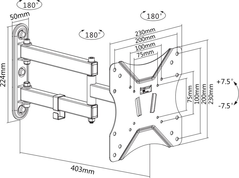 Genomtänkt konstruktion möjliggör enkel installation. Med egenskaper som en justerbar svängarm och ett tiltbart VESA fäste som säkerställer en perfekt betraktningsvinkel samt inbyggd kabelhantering för organiserade kablar. Väggfästet är VESA kompatibelt med måtten 75x75,100x100,200x100,200x200.