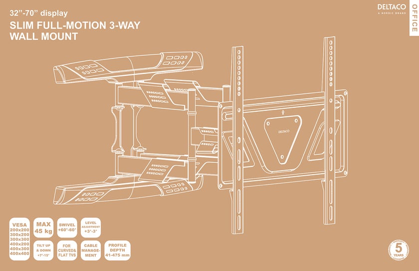 Fullt-artikulerande väggfäste från Deltaco, Ultra-Slim låg-profil fölr väggmontering. Tv-apparater och skärmar blir bara tunnare och tunnare, väggfästen måste hänga med! ARM-0258 är ett ultra slimmat väggfäste som placerar din tv så nära som 41 mm från väggen - samtidigt som den har förmågan att fullt-artikulera horisontellt! Tilta upp till 15° för att minska bländning och för att optimera betraktningsvinkeln. både väggplatta och kabelöverdrag är mönstrade med prickar, vilket bidrar till ett unikt och attraktivt utseende.