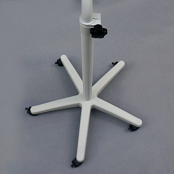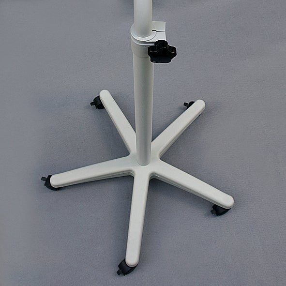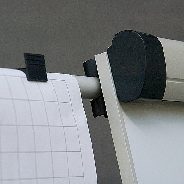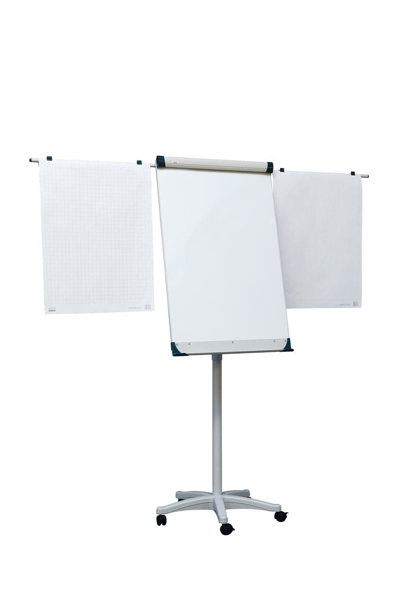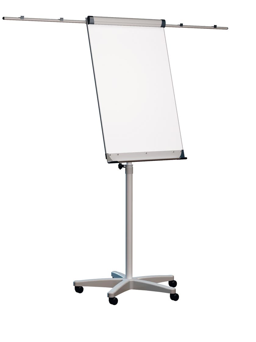 Magnetisk, skrivbar whiteboardtavla med aluminiumram. Höj- och sänkbart stativ tillverkat av gråmålat stål. Hjulbas i plast, tre av de fem hjulen är låsbara för enkel manövrering och placering. Många praktiska funktioner och fack. Ställbara krokar som passar alla blädderblock. Stor klämma överst gör att du enkelt fäster block på stativet. De två utdragbara sidoarmarna gör att kan hänga upp pappersark på vardera sida med hjälp av medföljande klämmor.