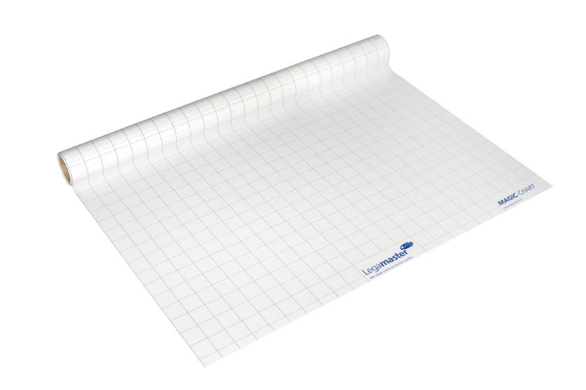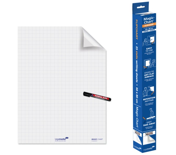 Blädderblock Legamaster Magic Chart, statisk skrivfilm i polypropylen, "fäster" på alla underlag (betong, glas, tapet, trä etc), fördelen att den inte behöver något blädderblocksställ utan man sätter upp detta statiskt laddade "papper" där man vill.