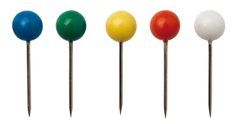 Kartnålar med runda huvuden. Ask med 100 nålar i blandade färger. Perfekt till mjuka underlag och markeringar på karta.