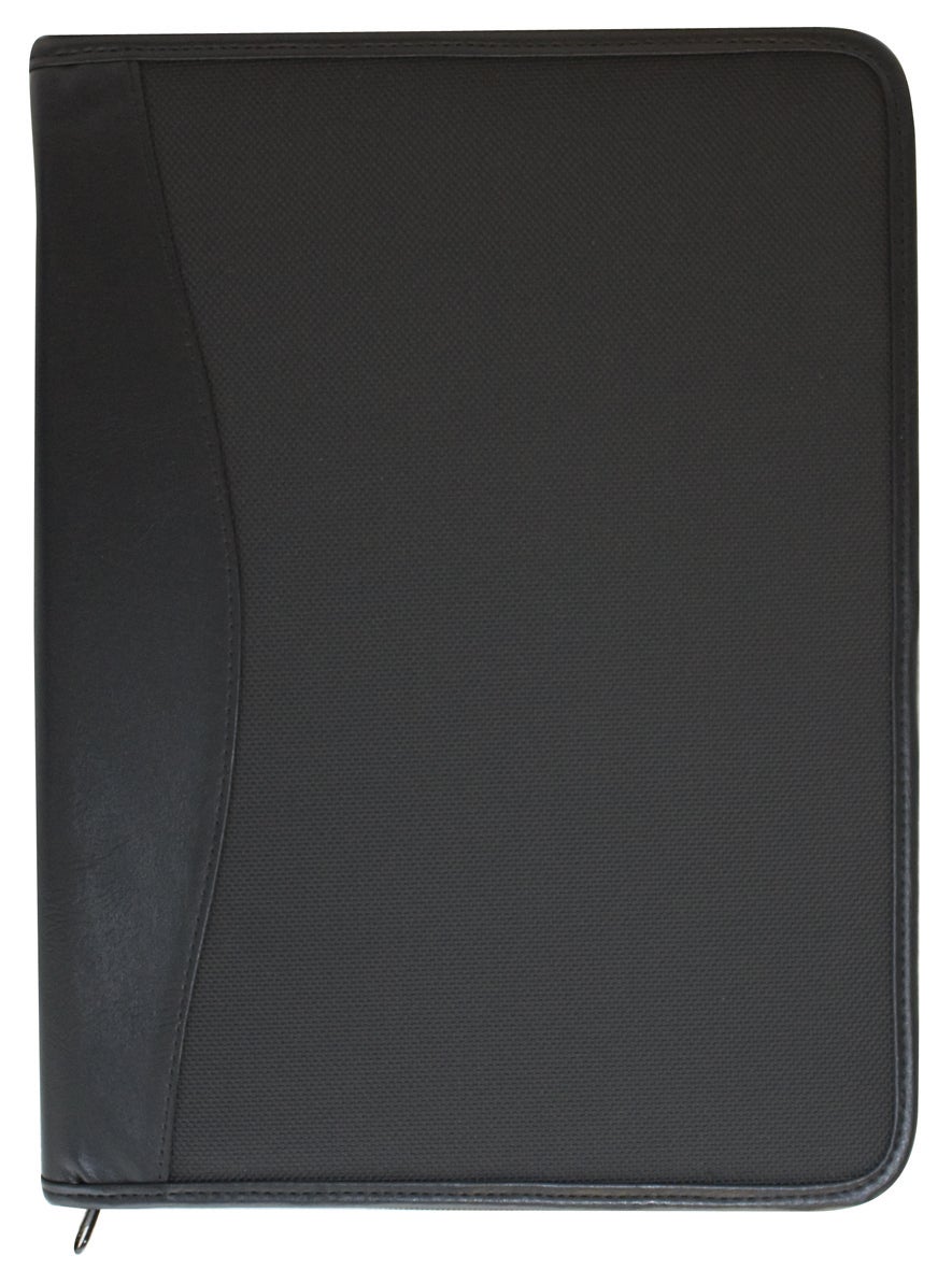 En snygg och stilfull praktisk konferensmapp i slitstark svart nylon med detaljer i konstläder och dragkedja.