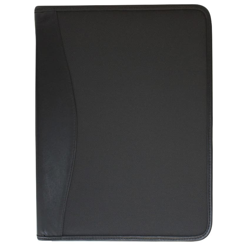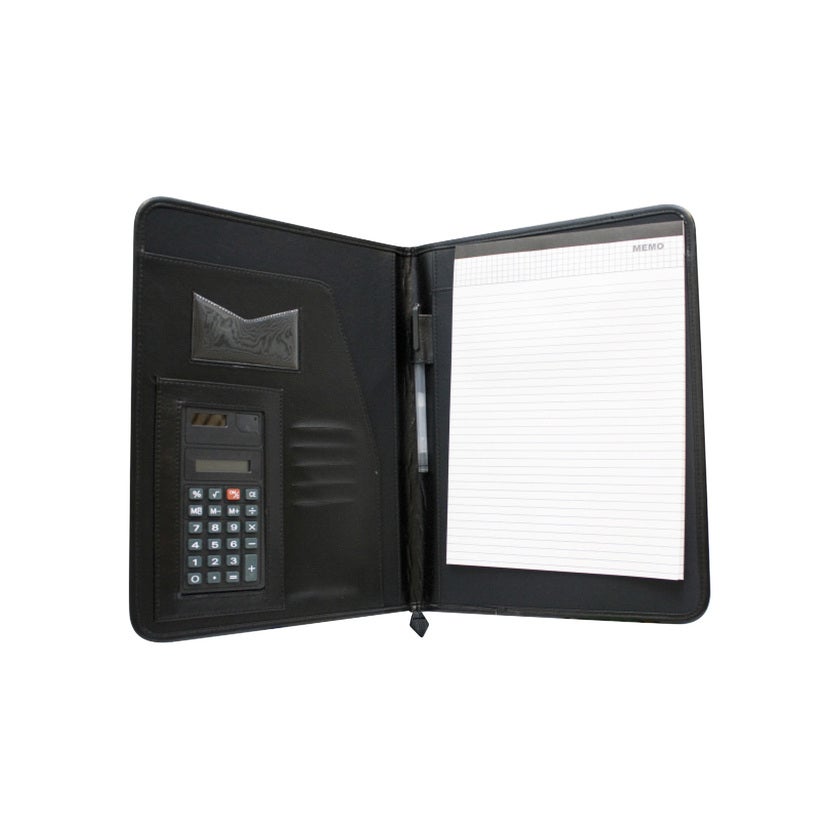 Snygg och stilren konferensmapp i slitstark svart nylon med detaljer i konstläder. Pennhållare, visitkortsficka, räknare samt ett A4 block ingår..